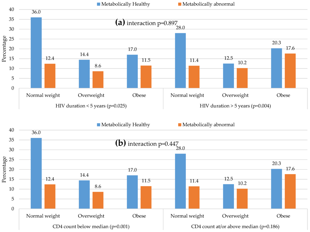 Nonetheless, the inclusion of participants from 17 healthcare facilities, including both urban and rural sites strengthens the representativeness in terms of the characteristics assessed. Furthermore, this study is among the first to describe the high prevalence of metabolically abnormal phenotypes across BMI categories in a relatively young HIV-infected population. The study findings underscore the need for further research, particularly longitudinal studies, to understand the development of cardio-metabolic abnormalities in the local HIV-infected population and the differential role played by conventional risk factors as opposed to HIV-related influences.