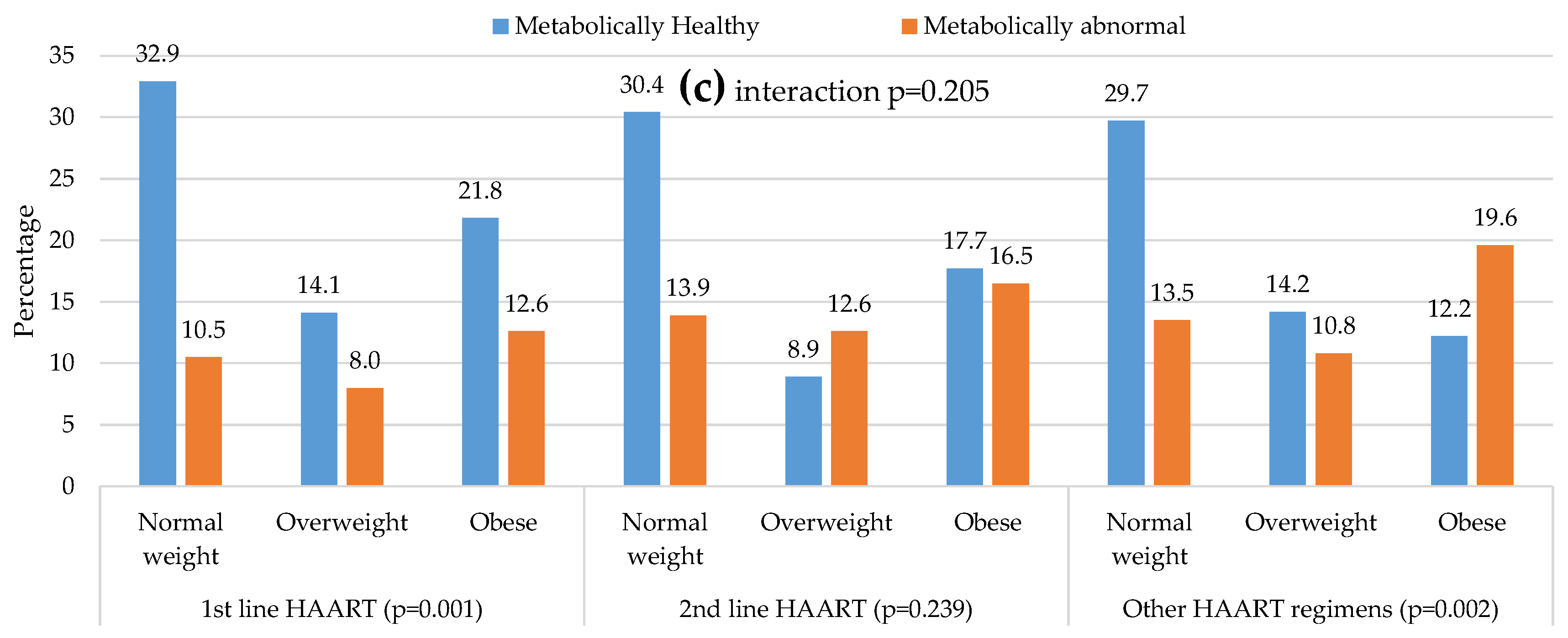 The distribution of metabolic phenotypes across BMI categories was not significantly different by longer or shorter duration of diagnosed HIV infection (median five years, p-interaction = 0.897) (Figure 3a), higher or lower CD4 count (median 392 cells/mm3, p-interaction = 0.447) (Figure 3b) or across the three ART regimens (p-interaction = 0.205) (Figure 3c). The proportion of ≥2 metabolic abnormalities tended to increase significantly and linearly across BMI categories within most of the latter subgroups except for lower CD4 count and the second line ART regimen.