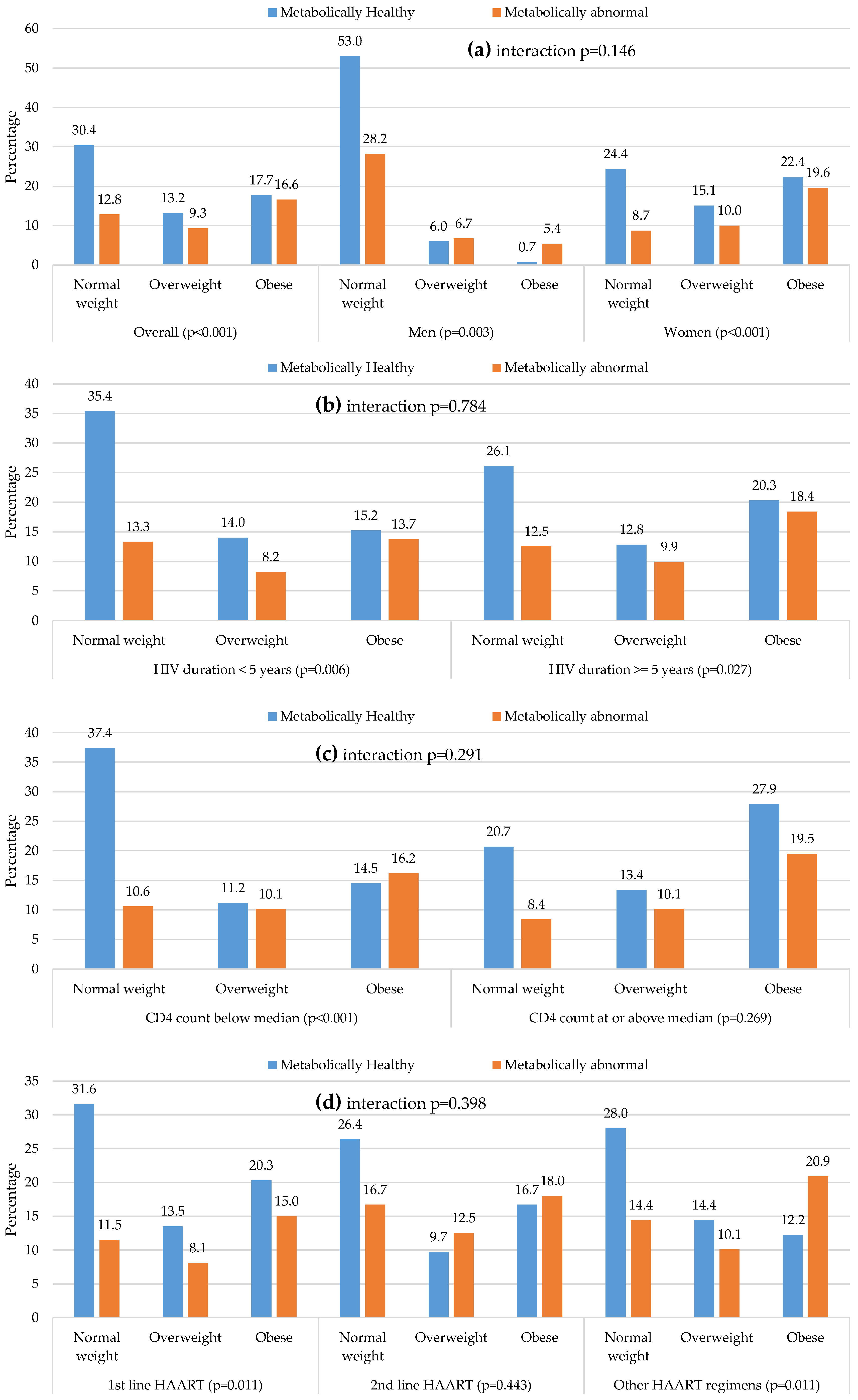 Distribution of metabolic phenotypes across body mass index by major characteristics: (a) Overall and in men and women; (b) in participants below, and those at or above the median of diagnosed duration of HIV infection; (c) in participants below and those at or above the median CD4 count; (d) in participants on different antiretroviral treatment regimens. Metabollically abnormal phenotype is based on the presence of any two of the following five abnormalities: elevated blood pressure or known hypertension; high triglycerides; low HDL-cholesterol, high blood glucose, or known diabetes; insulin resistance. For each figure panel, the p-values for the interaction (interaction p) in the distribution across complementary subgroups are, together with the p-value for linear trend in the distribution of metabolic phenotype across body mass index categories within each subgroup (p-value attached to the name of the subgroup). Each vertical bar represents the proportion of participants in the subgroup specific sample with the corresponding combination of body size (normal-weight, overweight, or obese) and metabolic phenotype (healthy or abnormal). The accompanying proportions are shown at the tip of each bar.