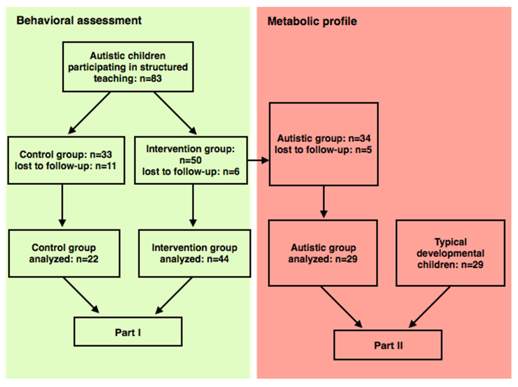 In part I of the study, 83 children with ASD who participated in structured teaching completed an open-label trial and were divided into an intervention group, supplemented with the folic acid for a period of three months, and a control group, which was not given any supplementation. Inclusion criteria were a diagnosis of ASD, which was made by a specialist clinician and confirmed by the Diagnostic and Statistical Manual of Mental Disorders, fourth edition (DSM-IV) diagnostic criteria. Exclusion criteria: children with Asperger’s or pervasive developmental disorders not otherwise specified, genetic disorders, chronic seizures, severe gastrointestinal symptoms, recent infection, or those who recently used high-dose vitamins or mineral supplements were ruled out.