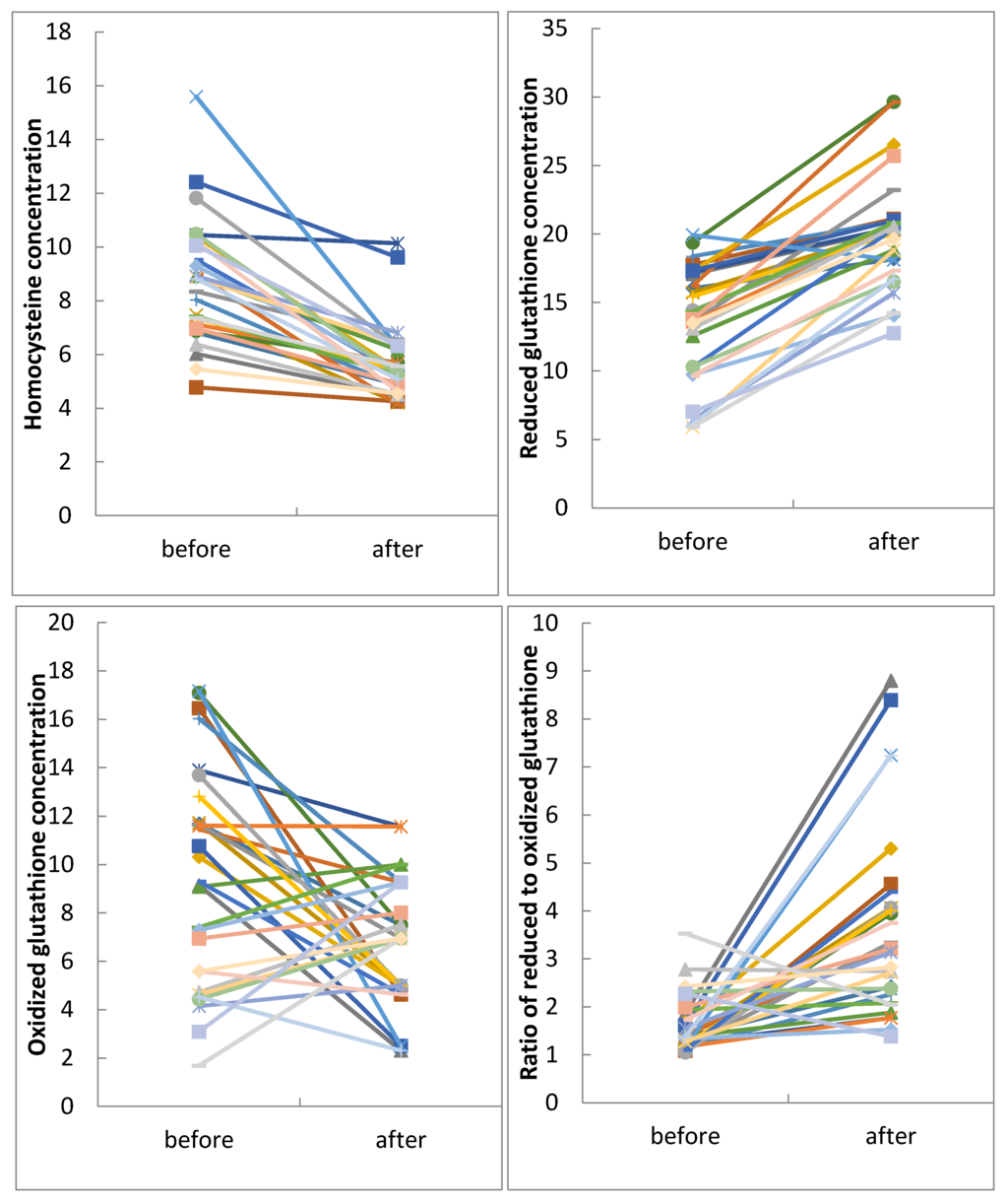 In Figure 3, scatter plots showing the distribution of the individual data points in the autistic group before and after intervention are presented for Hcy, tGSH, GSSG, and the tGSH/GSSG ratio (Figure 3).