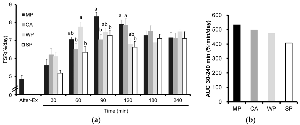 (a) Fractional rates of protein synthesis (FSR) in rats administered test solutions with a different protein content. The values are expressed as means (n = 6~8), with the standard error shown as vertical bars. Significant time × treatment interactions (p < 0.001) were found. a, b, c Mean values with unlike letters are significantly different (p < 0.05; Tukey’s post-hoc analysis); (b) Area under the curve (AUC) values for the 30–240 min period. MP, milk protein concentrate; CA, caseinate; WP, whey protein concentrate; SP, soy protein concentrate.