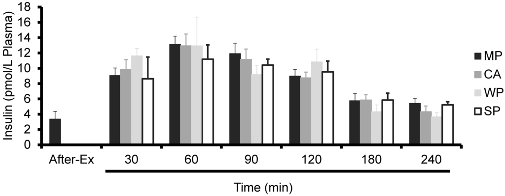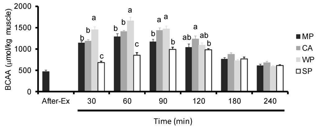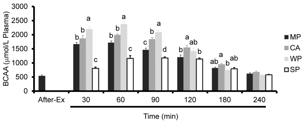 Similar to the trend observed for plasma Leu, the levels of plasma BCAA (isoleucine, leucine and valine) peaked at 60 min in all the groups. WP produced significantly higher plasma BCAA levels compared to all the other groups at 30, 60, and 90 min. CA caused a significant increase in plasma BCAA levels compared to either MP or SP at 90 and 120 min, to SP at 30 and 60 min, and to WP at 180 min. On the other hand, MP caused a significant increase in plasma BCAA levels compared to SP at 30, 60, and 90 min (Figure 4).