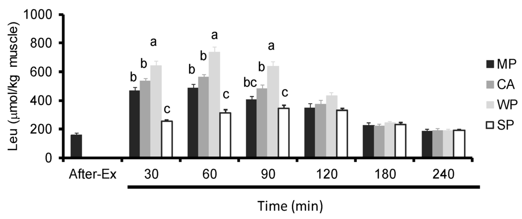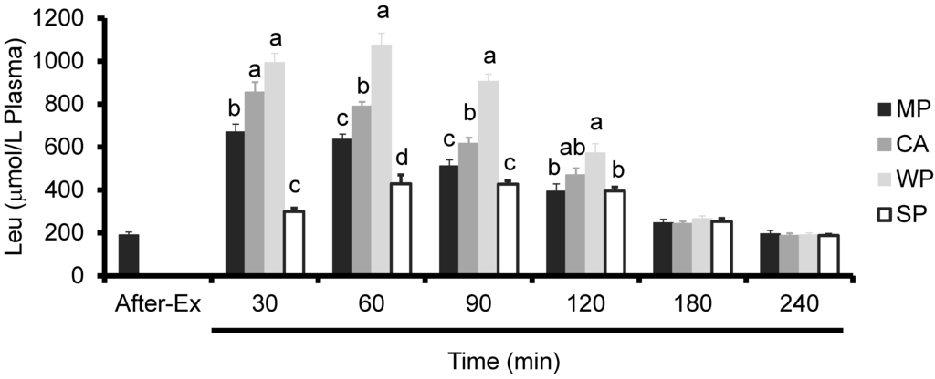 Plasma leucine levels in all the groups peaked at 60 min. WP produced significantly higher plasma Leu levels than all the other proteins at 60 and 90 min, and compared to MP and SP at 30 and 120 min. CA caused a significant increase in plasma Leu levels compared to MP or SP at 30, 60, and 90 min. On the other hand, MP caused a significant increase in plasma Leu levels compared to SP at 30 and 60 min (Figure 3).