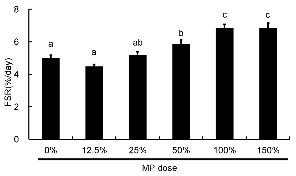Fractional rates of protein synthesis (FSR) following oral MP administration in rats. FSR was measured 60 min following administration of MP at doses ranging between 0 to 4.63 g protein/kg BW (100% = 3.09 g protein/kg BW). The values are expressed as means (n = 8~10), with the standard error shown as vertical bars. a, b, c Mean values with unlike letters are significantly different (p < 0.05; Tukey’s post-hoc analysis).