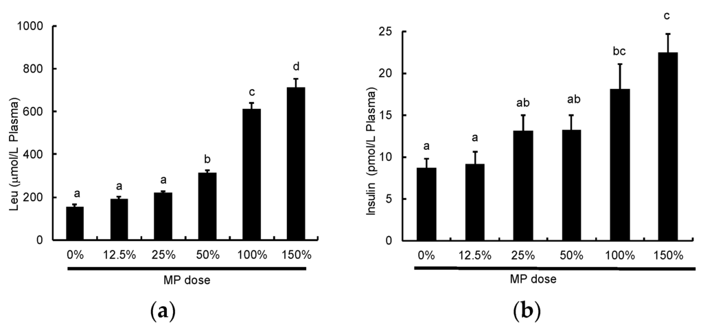 We also analyzed the dose-dependent effect of MP on plasma Leu and insulin levels. MP caused an increase in both plasma Leu and insulin levels in a dose-dependent manner (Figure 8a,b).