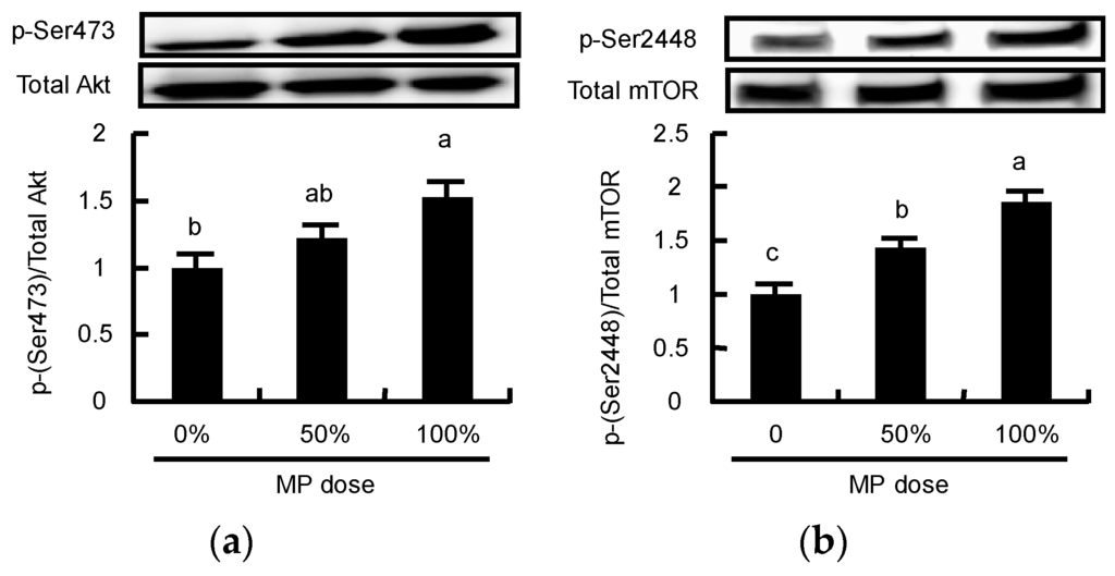 Finally, we analyzed the phosphorylation of Akt and mTOR to determine whether MP activated these proteins involved in mTOR signaling in a dose-dependent manner. MP caused greater phosphorylation of Akt at a dose of 100% compared to a dose of 0% (Figure 9a). MP also caused greater phosphorylation of mTOR in a dose-dependent manner (Figure 9b).