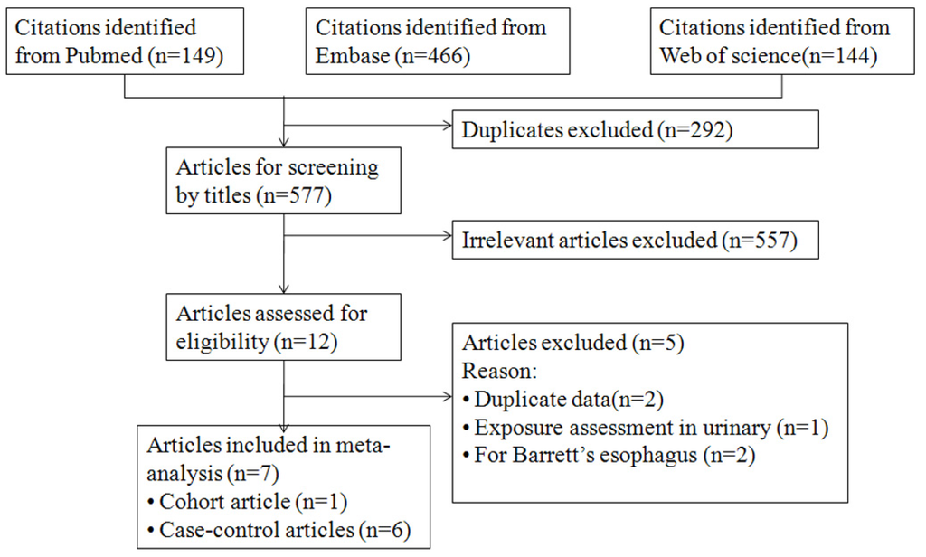A comprehensive literature search was conducted to assess the associations between total flavonoids, flavonoid subclasses, and esophageal cancer. Published papers were identified from three electronic databases: PUBMED [34], EMBASE [35], and Web of Science [36] for the period from January 1990 to April 2016. The following search terms were used: (flavonoids OR flavonols OR flavones OR flavanones OR flavan-3-ols OR flavanols OR anthocyanidins OR proanthocyanidins OR isoflavones) AND (esophageal OR esophagus OR oesophageal OR oesophagus) AND (neoplasm OR neoplasms OR cancer OR cancers OR carcinoma OR tumor OR tumors OR tumour OR tumours). Additionally, the references of the original literature reports and the related articles were also searched for potential complements, especially reviews and meta-analysis papers. Only full length original journal articles were considered and no attempt was made to include abstracts or unpublished studies.