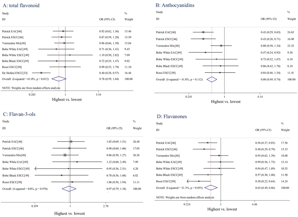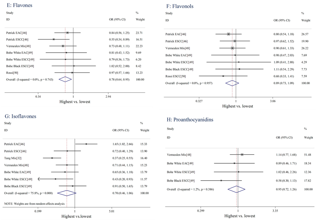 Forest plots for the association between dietary flavonoid intake and esophageal cancer risk (highest vs. lowest categories).