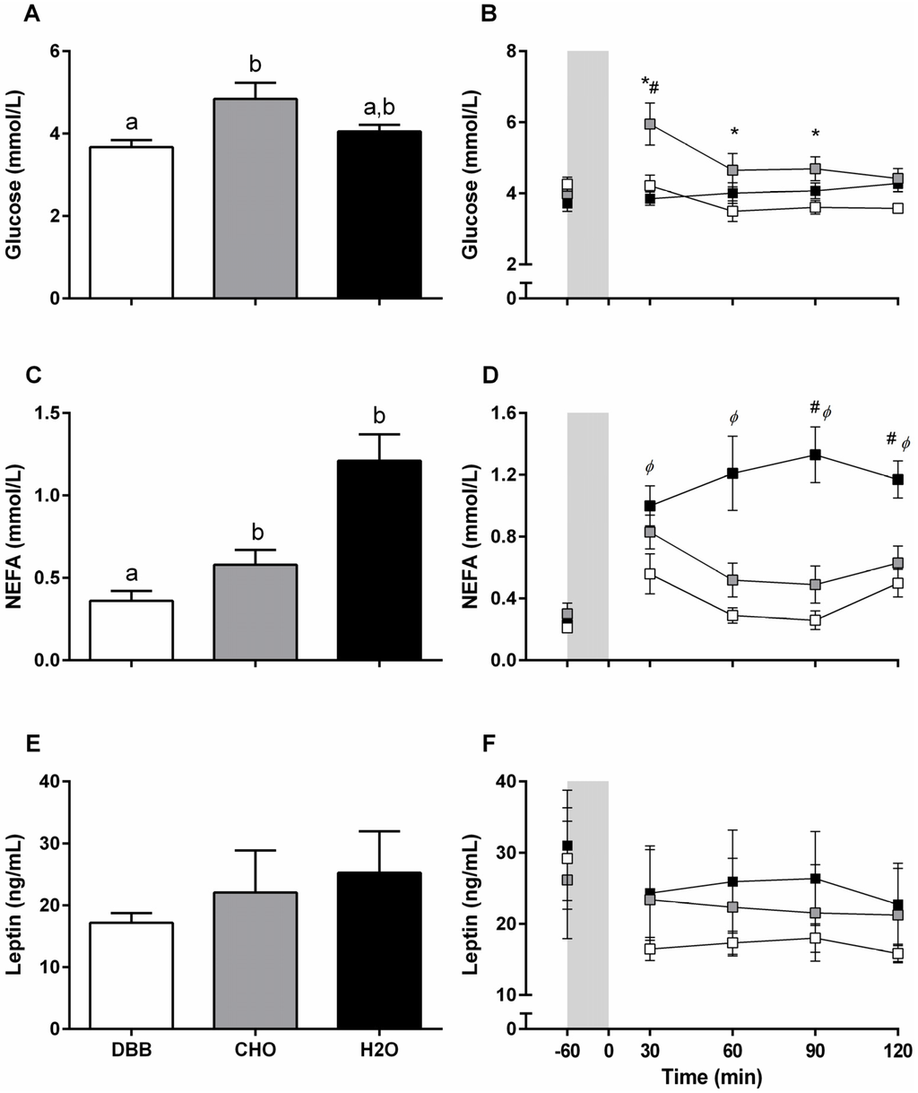 Time-average (90 min) (A,C,E) and plasma concentrations (B,D,F) of glucose (mmol/L), NEFA (mmol/L), and leptin (ng/mL), respectively, pre (−60) and throughout the 120 min recovery period (n = 13). Vertical grey shaded area (B,D,F) represent the 60 min cycling bout. Values are presented as mean ± SEM. Values with unlike letters (a,b) denote significant difference between trials. White filled boxes (