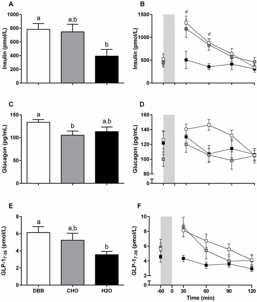 Time-average (90 min) (A,C,E) and absolute postprandial plasma concentrations (B,D,F) of insulin (pmol/L), glucagon (pg/mL), and GLP-17-36 (pmol/L) respectively pre (−60) and throughout the 120 min recovery period (n = 13); Vertical grey shaded area (B,D,F) represent the 60 min cycling bout. Values are presented as mean ± SEM. Values with unlike letters (a,b) denote significant difference between trials. White filled boxes (