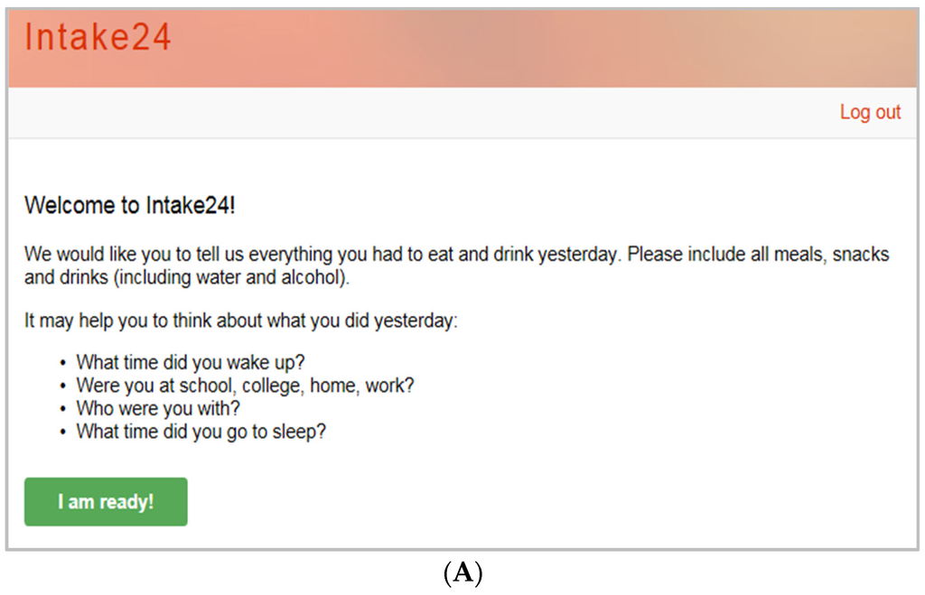 Screen shots of INTAKE24; (A) User instructions for INTAKE24; (B) Food and drink entry interface.