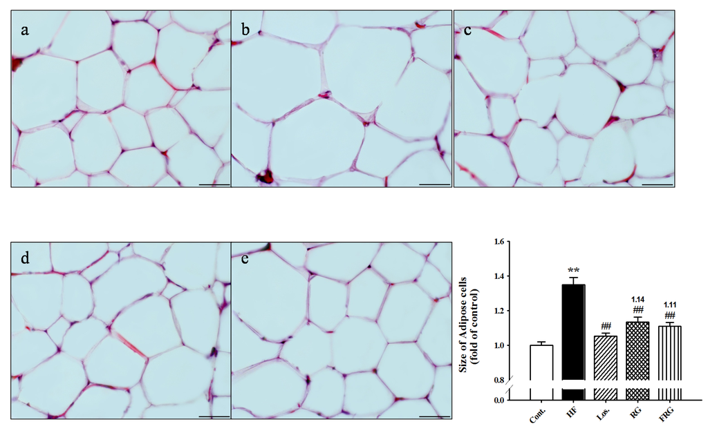 Because FRG effectively reduced the epididymal fat pad weight, we prepared frozen sections of epididymal fat pads and stained them with H & E. Histological findings, as shown in Figure 1, revealed hypertrophy of adipocytes in HF diet groups compared with the control group (+34.86%, p < 0.01). However, treatment of FRG, Los. and RG groups showed significantly decreases in the hypertrophy of adipocytes (−23.81%, −29.62% and −21.44% respectively, p < 0.01) (Figure 1).