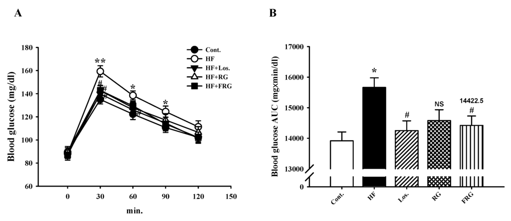 Effect of an FRG on oral glucose tolerance tests (A) and the blood glucose area under curve (AUC) (B). Values were expressed as mean ± S.E. (n = 10). * p < 0.05, ** p < 0.01 versus Cont.; # p < 0.05 versus HF. Abbreviations: HF, high fructose; HF + Los., high fructose diet with losartan; HF + RG, high fructose diet with red ginseng; HF + FRG, high fructose diet with fermented red ginseng.