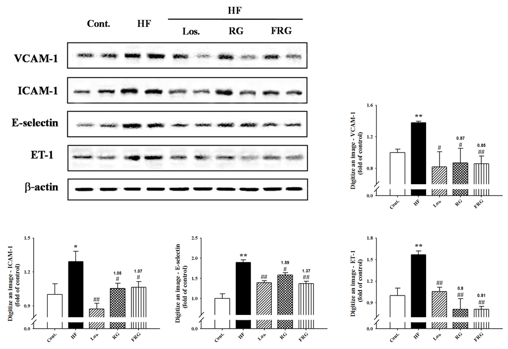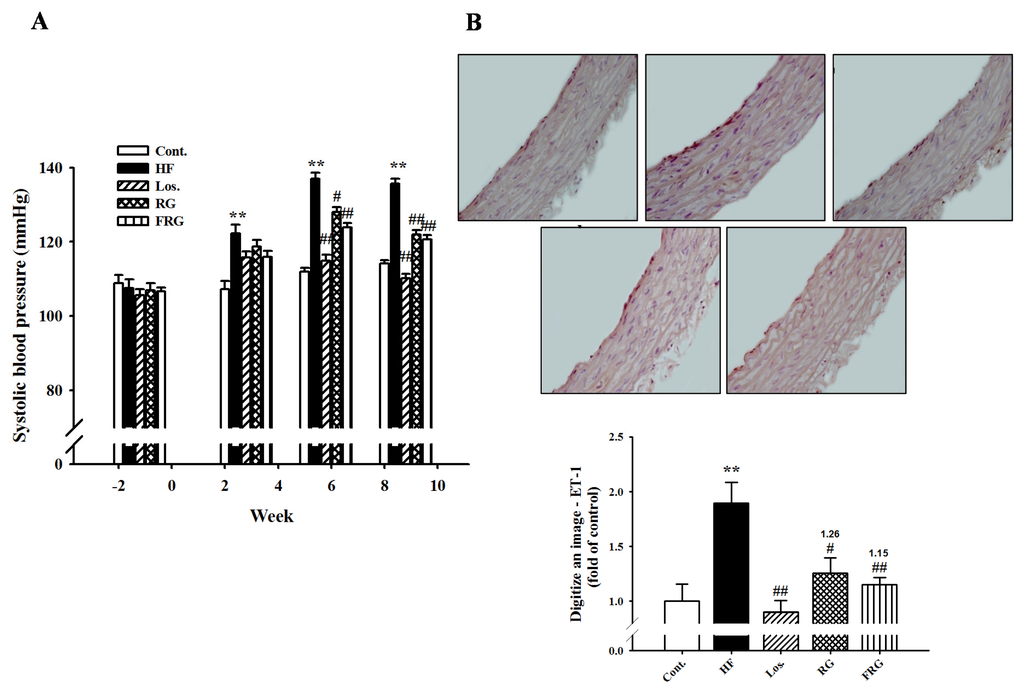 At the beginning of the experimental feeding period, the levels of systolic blood pressure in all groups were approximately 106–108 mmHg as investigated by the tail-cuff technique. After eight weeks, systolic blood pressure of HF groups were significantly increased compared to that of the control groups (p < 0.01). However, treatment of FRG and RG groups was significantly decreased compared to that of the HF groups during all experimental period (135.7 ± 1.3 versus 120.7 ± 1.1 and 122.0 ± 1.1, respectively, p < 0.01) (Figure 3A). Similarly, treatment of losartan showed similar results to FRG and RG groups. In addition, the protein expression of ET-1 level was increased in the HF diet group compared with the control group. However, administration drug groups showed significantly decreased expression levels of protein compared with HF diet groups (Figure 3B and Figure 4).