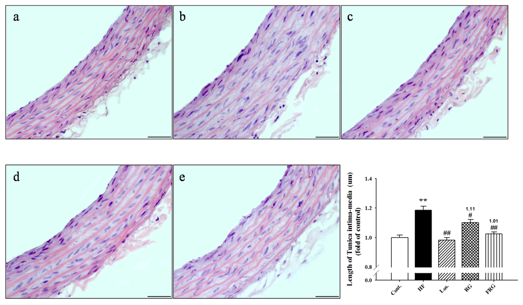 Representative microscopic photographs of H & E stained section of the thoracic aorta in HF diet rats. Lower panel indicated length of intima-media. Lower panel indicated the size of adipose cells (magnification ×400). (a) control; (b) HF; (c) HF + Los.; (d) HF + RG; (e) HF + FRG. Values were expressed as mean ± S.E. (n = 3). ** p < 0.01 versus Cont.; ## p < 0.01 versus HF.