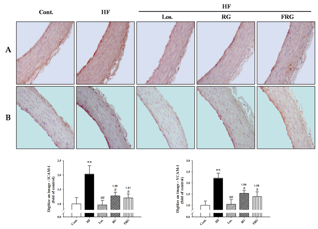 Immunohistochemistry was performed to determine the direct expression of adhesion molecules in the aortic wall. Adhesion molecule expressions such as ICAM-1 and VCAM-1 were increased in the HF diet groups (p < 0.01). However, treatment of FRG and RG groups was significantly decreased expression levels of protein (ICAM-1 and VCAM-1, p < 0.05) (Figure 4). Similarly, treatment of losartan groups showed similar results to FRG and RG groups. Moreover, FRG was found to be more effective in decreased expression levels of protein levels compared with RG groups.