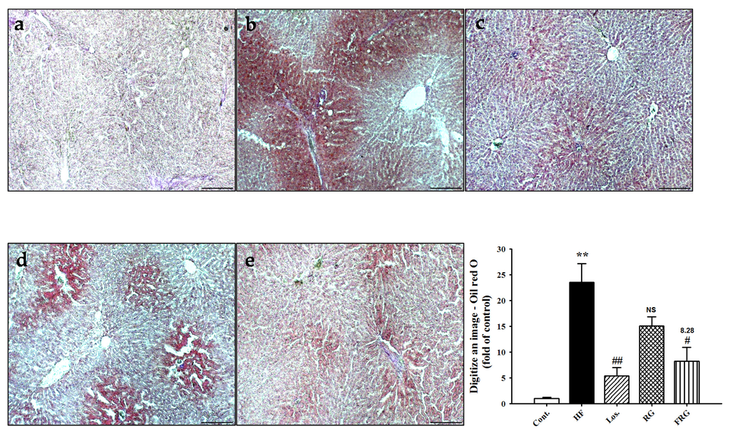 To investigate the existence of fat accumulation in the livers in all experimental groups, we prepared frozen sections of livers and stained them with Oil red O. Lipid droplets were detected in HF diet groups. However, treatment of FRG groups showed that the number of lipid droplets significantly decreased compared with HF diet groups (Figure 7). Similarly, treatment of losartan group showed similar results to the FRG groups. However, RG groups was no significant in RG groups compared with HF group. These results also showed that FRG was found to be more effective in decreased lipid droplets compared with RG groups.