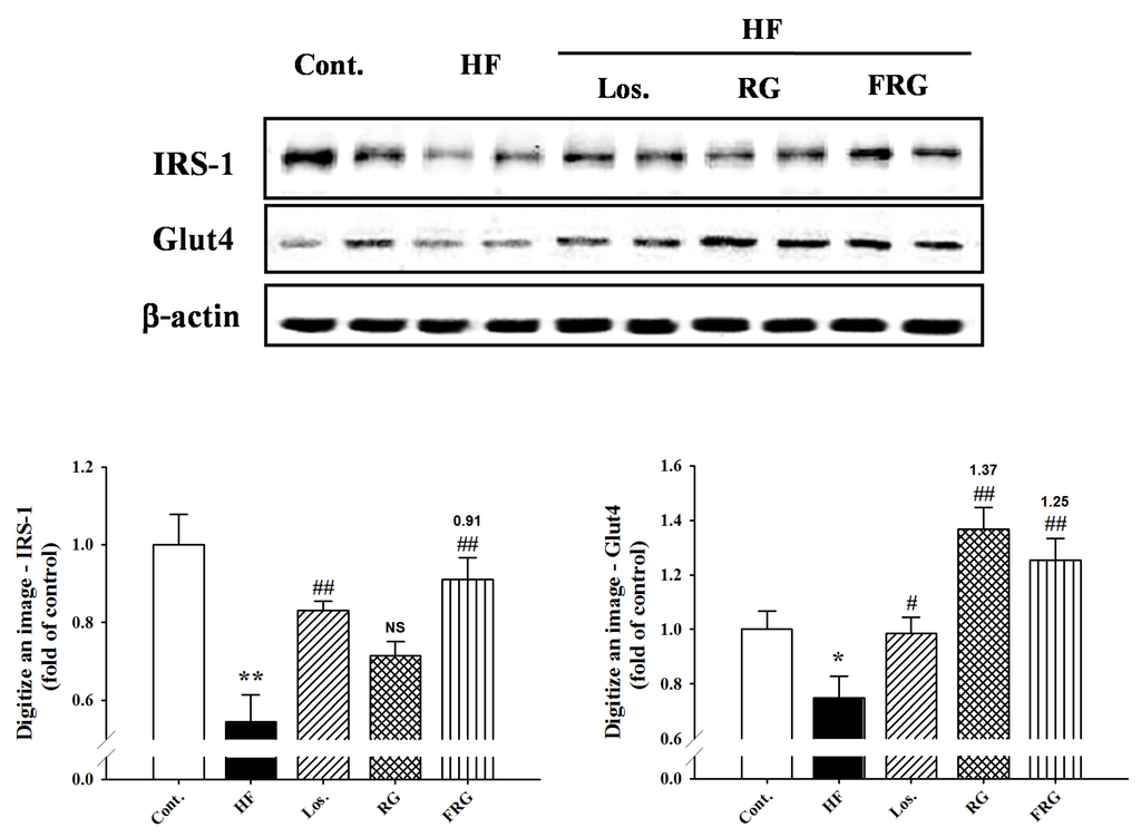 To investigate the signals in insulin signaling, we examined the expression of IRS-1 and Glut4 in muscle tissue. The expression of IRS-1 and Glut4 were significantly decreased in HF diet groups. However, treatment of FRG groups increased expression levels of protein compared with HF diet groups (Figure 8). Similarly, treatment of losartan groups showed similar results to FRG groups.