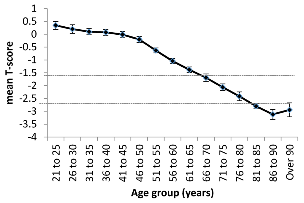 A study of women across seven Asian countries (Singapore, Taiwan, Thailand, Vietnam, Malaysia, Indonesia, and the Philippines) using the Lunar Achilles heel scanner demonstrated that the mean T-score of the women assessed decreased dramatically with ageing (Figure 1). The authors noted that over 50% of women aged 55+ were osteopenic (T-score <−1.5) or osteoporotic (T-score <−2.5) [9]; by the age of 70, more than half were frankly osteoporotic.