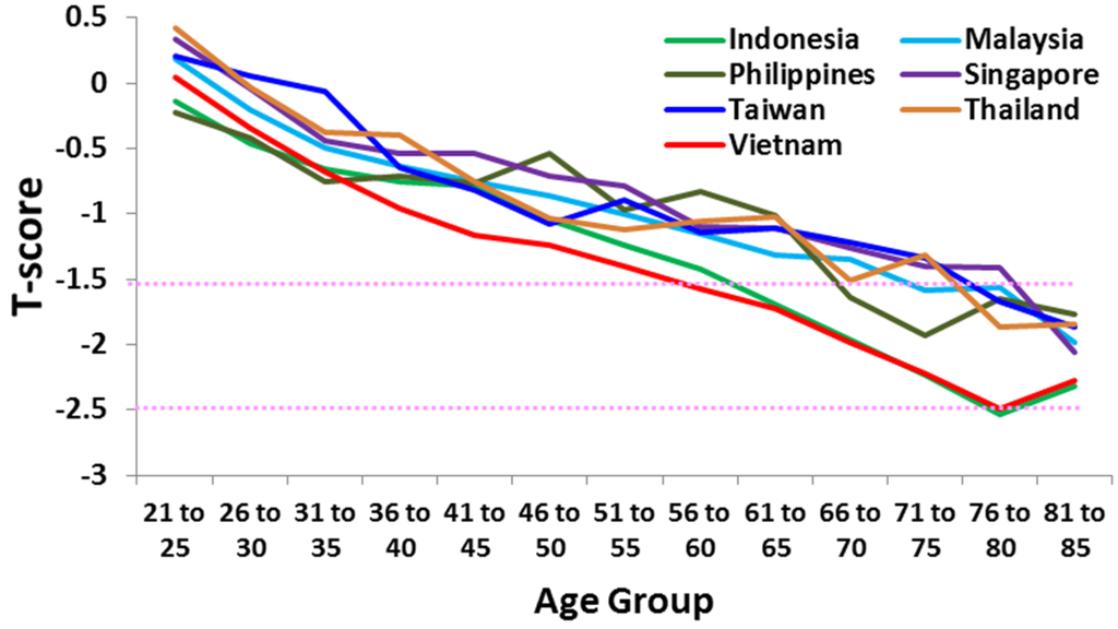 Mean T-scores by age group of men in Singapore (N = 6563), Taiwan (N = 6714), Thailand (N = 3150), Vietnam (N = 35,320), Malaysia (M = 59,458), Indonesia (N = 36,594), and the Philippines (N = 25,527) [16]. Dotted horizontal lines indicate osteopenia (−1.5) and osteoporosis (−2.5).
