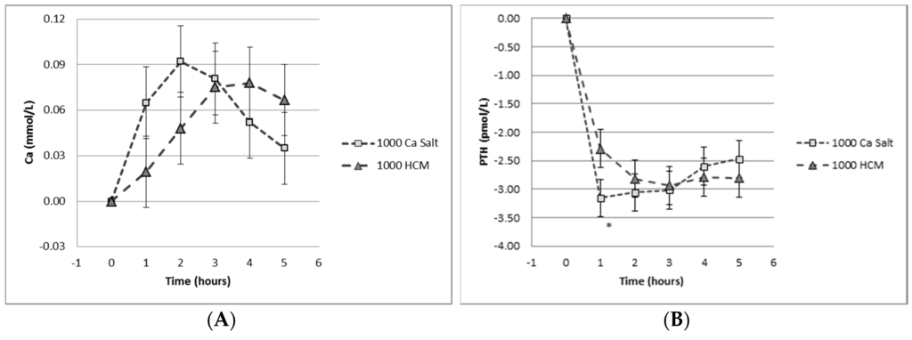 Effect of calcium delivery mode. Graphs depict the response 0–6 hours after the oral intake of 1000 mg calcium salt versus 1000 mg calcium in milk on (A) serum calcium and (B) serum parathyroid hormone (PTH). Reprinted with permission [74].