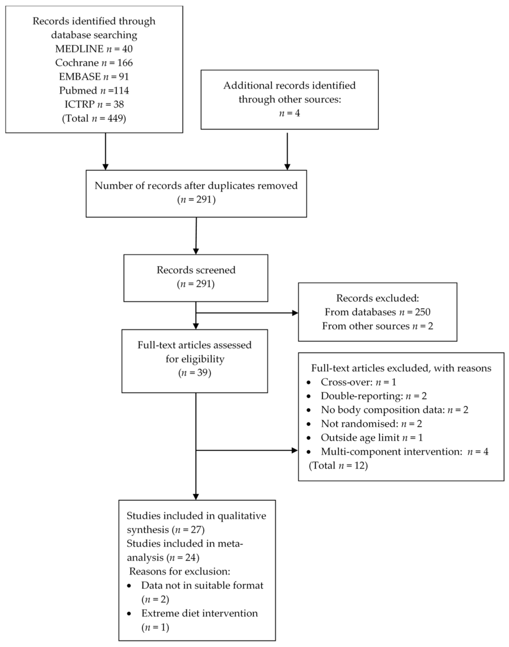 Twelve full-text studies were excluded for the following reasons: studies using a cross-over design [26]; double-reporting (sub-studies of other RCT) [27,28]; no body weight or composition data reported [29,30]; interventions not randomized [31,32]; study population outside of age limit [33]; and multi-component interventions [34,35,36,37].