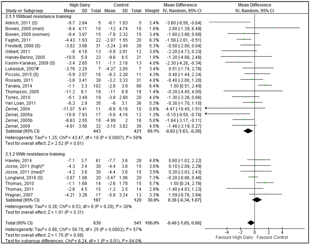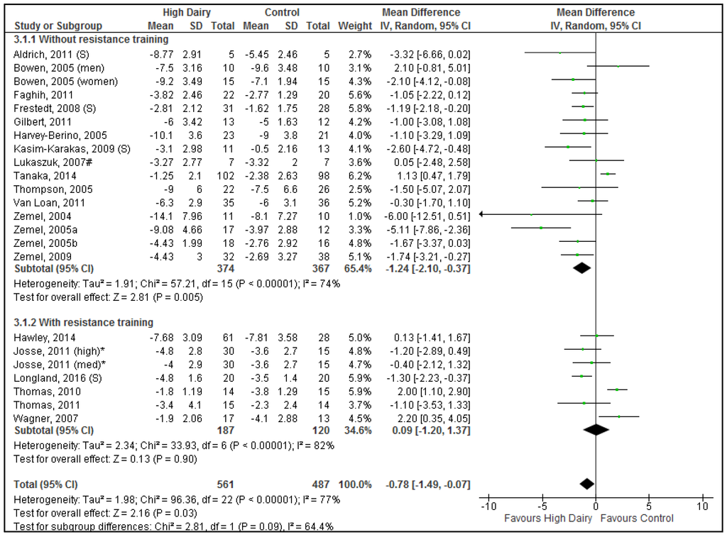 The primary meta-analyses compared mean (95% CI) differences (net change in kg) in body weight, fat mass and lean mass between high dairy and control groups. Due to heterogeneity between studies and to avoid false positive results for subgroup analysis, a random-effects model was used to calculate Forest plots with weighted mean differences and 95% CI. Heterogeneity between studies were indicated using a combination of Chi2- (p < 0.1) and I2 statistics (I2 0%–40% = low; 30%–60% = moderate; 50%–90% = substantial and 75%–100% = considerable heterogeneity) and considering the variation of point estimates and overlap of CIs across studies [17,19]. A priori subgroup differences (resistance training vs. no resistance training) and whole dairy food vs. dairy supplements) were assessed using Chi2-statistic with a p-value of < 0.05 taken to indicate statistical significance [19]. Subgroup differences between studies using skim/low-fat dairy vs. studies that did not specify dairy type were also explored. Subgroup analysis on study duration and baseline dairy intake could not be performed because of limited number of studies that were >12 months duration or that reported dairy intake at baseline. Subgroup analysis also could not be performed on sex because of the low proportion of men included in studies.