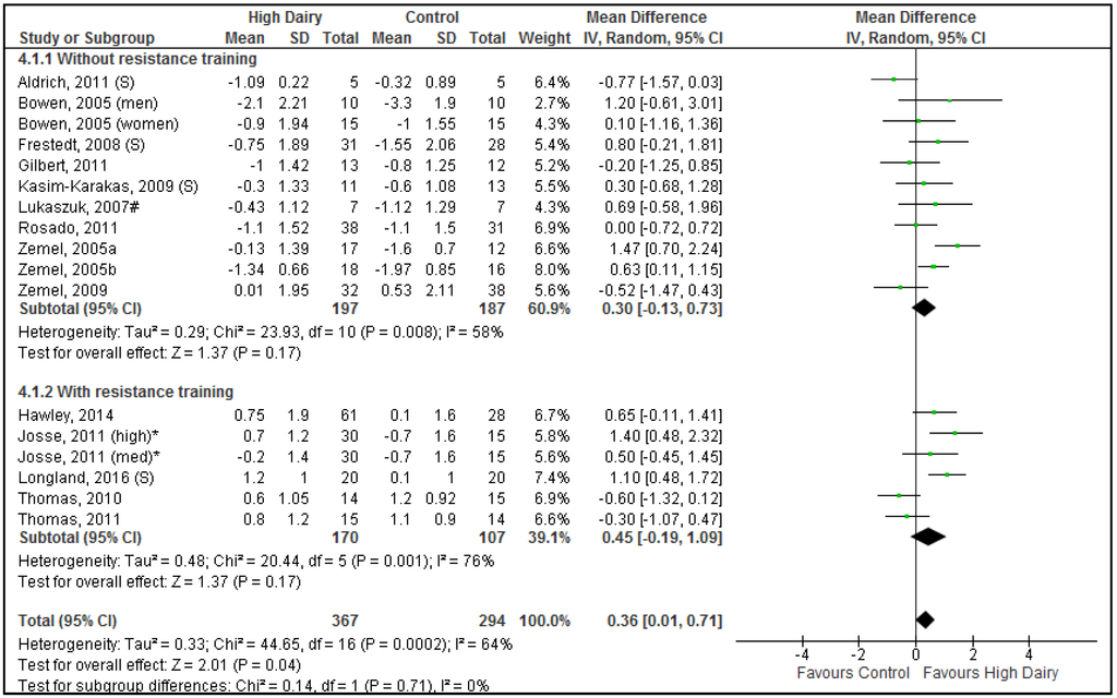 A total of 661 participants (528 in dairy food studies; 133 in dairy supplement studies) in 17 comparisons (13 using dairy food; 4 using dairy supplement) (from 15 studies (11 using dairy food; 4 using dairy supplements)) were included in the analysis for lean body mass change during energy restriction. Resistance training sub-groups did not differ significantly (Chi2 = 0.14, p = 0.71) (Figure 4) hence the results described are from the resistance training and non-resistance training studies combined. Overall (when all studies are pooled), reductions in lean mass associated with weight loss were significantly less with increased dairy intake compared to control interventions (0.36 kg [0.01, 0.71 kg], p = 0.04) (Figure 4). The weighted average reduction in lean mass in the control groups was −0.56 ± 1.54 kg; 95% CI −0.38, −0.74 whereas the weighted average reduction in the dairy groups was −0.12 ± 1.57 kg; 95% CI 0.04, −0.28, hence lean mass loss was attenuated by ~75% in the dairy intervention groups. Substantial heterogeneity was seen for lean mass results (p < 0.001, I2 = 64%). The heterogeneity did not appear to be associated by any one study or specific study characteristic. Dairy food vs. dairy supplement studies did not differ significantly (p = 0.98).