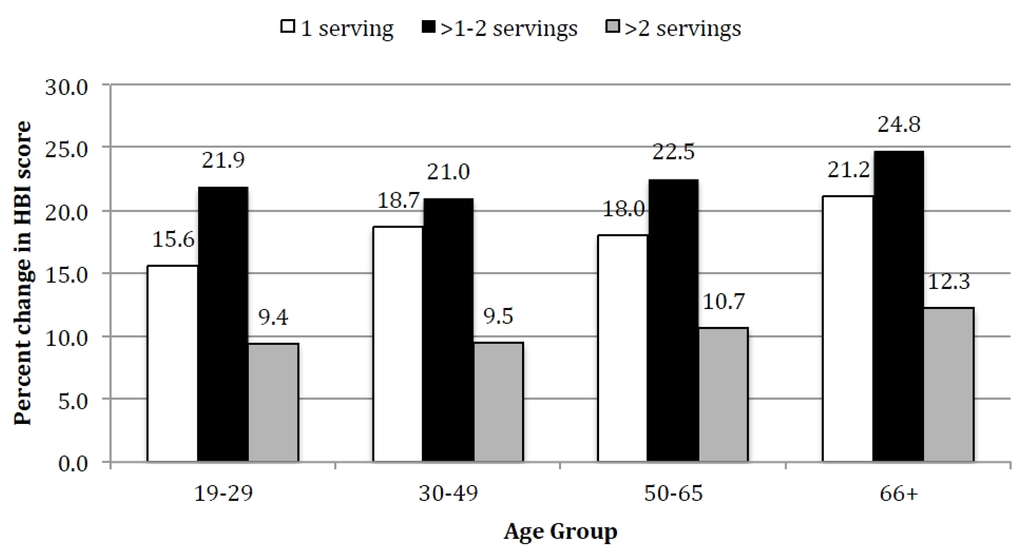 Replacing one serving of SSB with water was predicted to improve HBI scores regardless of age groups and across all levels of SSB consumption (Figure 1). At the highest level of SSB consumption (>2 servings SSB), the impact of replacing one serving of SSB with water was greatest for the oldest age group (66+ years, 12.3% increase in HBI score). Regardless of age, replacing one serving of SSB with water had the greatest impact on HBI score among those who consumed between 1 and 2 servings of SSB (range: 21.9%–24.8% increase in HBI score, Figure 1), and this effect was greater for those in older (66+ years) compared to younger (19–29 years) age groups.