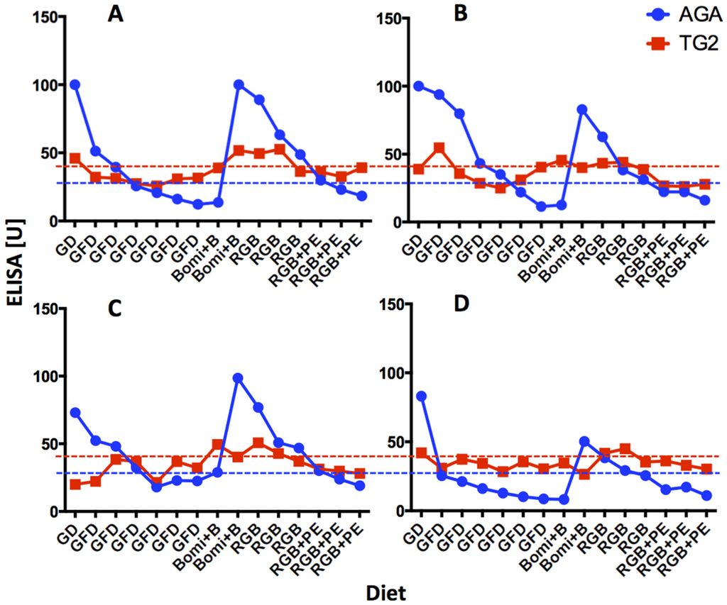 Anti-gliadin antibodies (AGA) and anti-intestinal tissue transglutaminase (TG2) plasma antibodies in four gluten-sensitive (GS) rhesus macaques (A–D). Gluten-modified diets (GD, GFD, Bomi + B, RGB and RGB + PE) that were used to feed the macaques are indicated. Individual time points represent two-week intervals. Blue dashed line represents AGA baseline, i.e., 25 ELISA units while red dashed line represents TG2 antibody baseline, i.e., 40 units. Values elevated above these lines were significantly greater (p < 0.05) than values generated with plasmas from healthy, normal macaques.