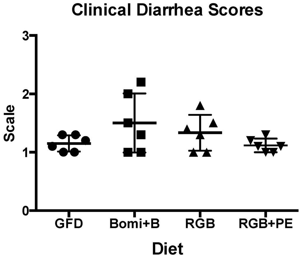 Clinical diarrhea scores generated with GS macaques fed gluten-modified diets (GFD, Bomi + B, RGB and RGB + PE) are shown.