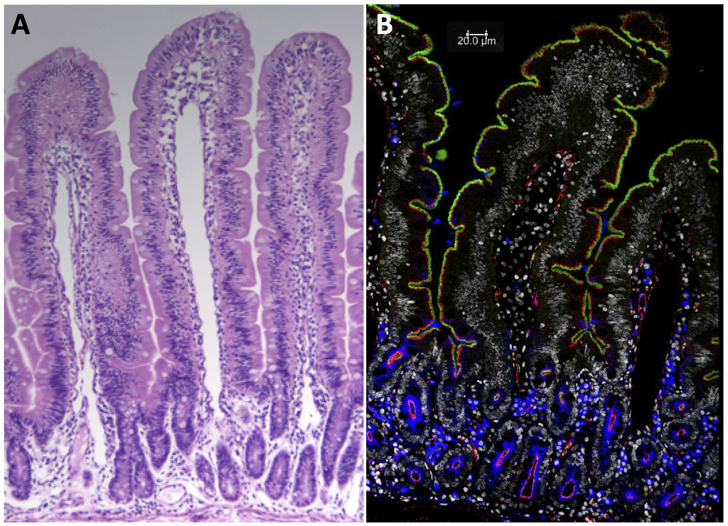 H & E staining of jejunum from a GS macaque while on GFD reveals normal-range intestinal architecture, magnification 10× (A); Four-color confocal microscopy of jejunum from another animal on GFD (B) shows undisrupted continuity of villin (green) and tight junction protein ZO-1 staining (red). Abundant IgA-positive B cells are seen in the subepithelium (blue). Gray = nuclear DNA.