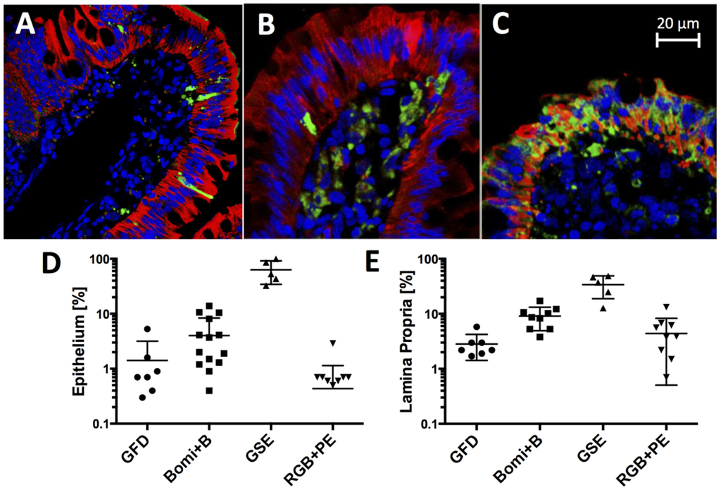 In order to study histopathological changes on a cellular level, confocal microscopy of small intestinal biopsies was used (Figure 4). Epithelial and subepithelial (lamina propria, i.e., LP) cells that were positive for active caspase were designated as “apoptotic” and their proportions (%) from total epithelial and LP cells were recorded. The highest proportions of apoptotic cells were found in historical GSE controls, i.e., adult rhesus macaques with CD-like symptoms that were not part of this study except for use as comparisons. Both epithelial and LP apoptotic cell counts from GSE controls were significantly higher (p < 0.001) than those generated with juvenile GS macaques, regardless of the GFD, RGB + G, or Bomi + B diets (Figure 4A–E). The highest proportions of apoptotic cells in juvenile GS macaques were found in biopsies taken while animals were fed Bomi + B diet. After the switch from Bomi + B to RGB diets, the numbers of apoptotic cells started to decline. After one month on RGB diet, followed by one month on RGB + PE diet, apoptotic cell counts decreased to levels comparable with those ascribed to GFD (Figure 4D,E).