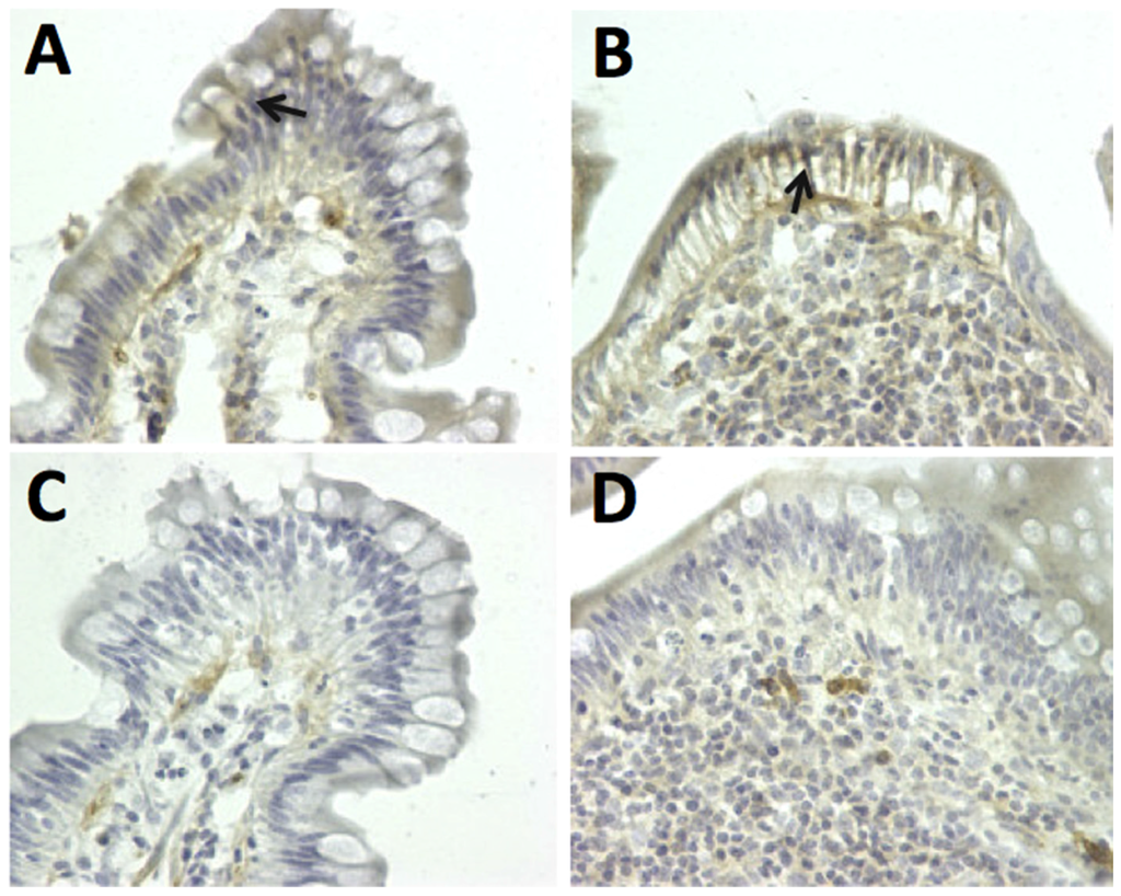 Jejunum biopsies collected from GS macaques on Bomi + B diet show an increased IL-15 staining, indicated by arrows (A,B) while lower intensity of such signal was detected in tissues stained with unrelated, isotype-matched antibodies or in healthy control biopsies (C,D), magnification 40×.