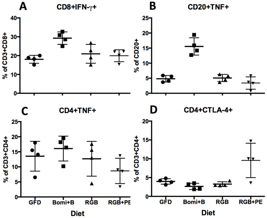 Proportions of IFN-γ, TNF and CTLA-4 inflammation-regulatory molecules—expressed by peripheral blood lymphocytes—were measured by multi-color FACS. Significant and consistent increases in expression of IFN-γ by CD3 + CD8 + T cells and TNF by CD20 + B cells were found in Bomi + B diet-fed GS macaques (Figure 6A,B). Only a non-significant trend for increased expression of TNF by CD3 + CD4 + T cells was detected following the administration of Bomi + B diet (Figure 6C and Supplementary Materials Figure S3).