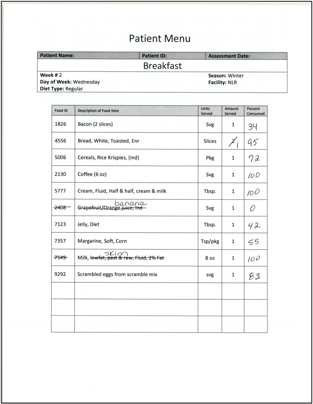 A picture of a Nutrition Intake Assessment Form (NIAF), which lists the foods scheduled to be served for a given meal based on the published hospital menu plan, showing the end-user handwritten modifications indicating what foods were actually served.