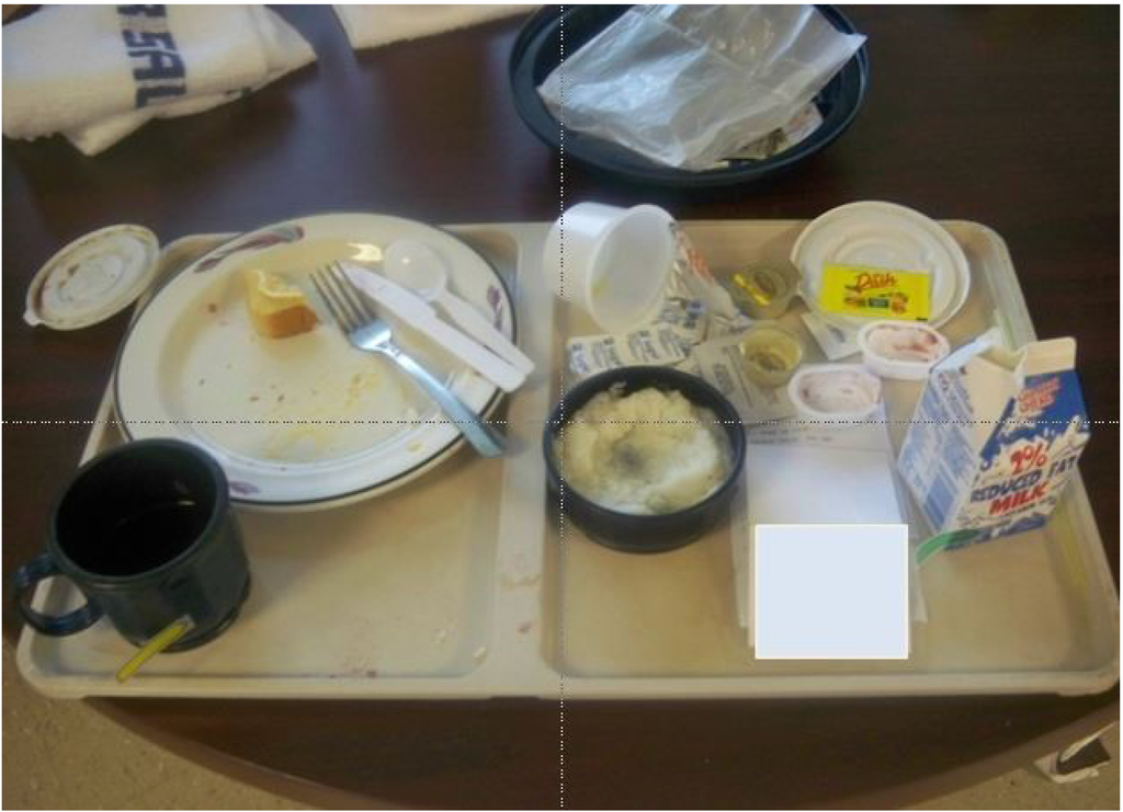 One method to improve the accuracy of calorie counts is the use of photography to verify what food the patient receives and how much of that food the patient eats [2,11,12,13,14,15,16,17,18,19,20]. This method involves taking photographs of a patient’s tray before and after the meal. By comparing these before and after photographs, a trained staff member can calculate the patient’s nutrient consumption with much greater accuracy than by using routine methods of obtaining such estimates [2,12,15]. Previous studies indicate estimates based on photographs correlate well with calorie counts obtained by highly trained specialized teams, although not with estimations by nursing staff using standard methods [2,12,15]. Photography also compares well with weighing the provided food before and after the meal [2,11,12,14,15,16,18]. However, the photographic method has a number of significant limitations. One is the inability to detect the addition or subtraction of foods from the patient’s tray between photos. A second limitation of photographs is failure to depict the composition or amount of every food item provided or the percentage of each food item consumed, particularly for those items in opaque containers. Most significantly, in order to calculate total macro- (i.e., protein, energy, and fat), and micronutrient (e.g., vitamin and mineral) composition of the consumed food, staff must undertake an arduous process including estimation of all the aforementioned parameters, identifying the nutrient content of each food item using a large database, entering the resulting values in a spreadsheet, and adding all of the individual estimates. This process takes significant time and human resources, which considerably deters the collection of precise calorie counts.