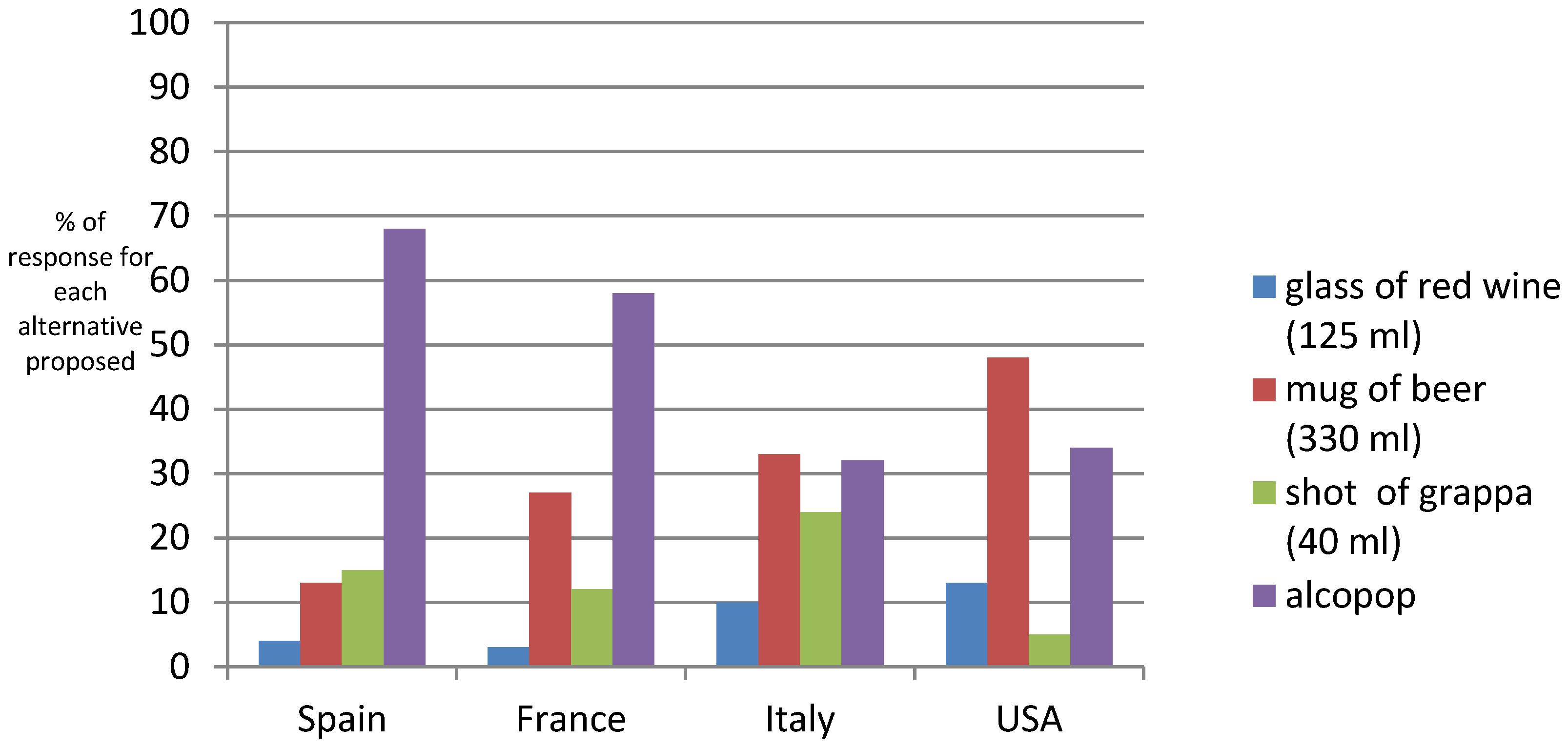 Figure 2, in France and Spain, consumers indicated the correct option (alcopop) in most cases (respectively, 58% and 68%). By contrast, Italian and US consumers indicated the correct option only in 34% of cases, assigning a greater kcal content to a mug of beer (in 48% of cases in the US and 33% in Italy).