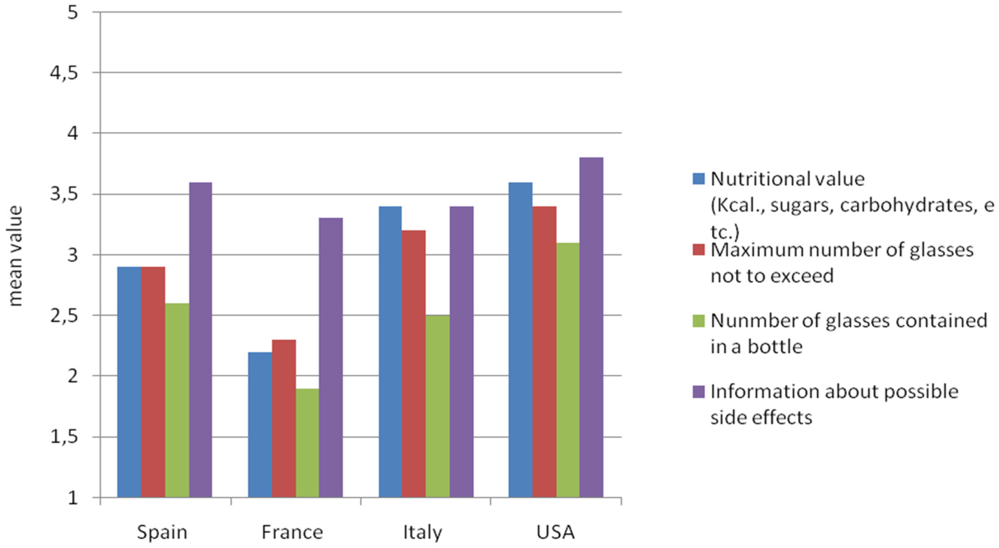 Figure 3 reports results as mean values. Consumers from all countries stated a higher interest in information on possible side effects related to excessive consumption, whereas they showed lower interest in the number of glasses contained in a bottle. Moreover, findings underline significant differences among countries.