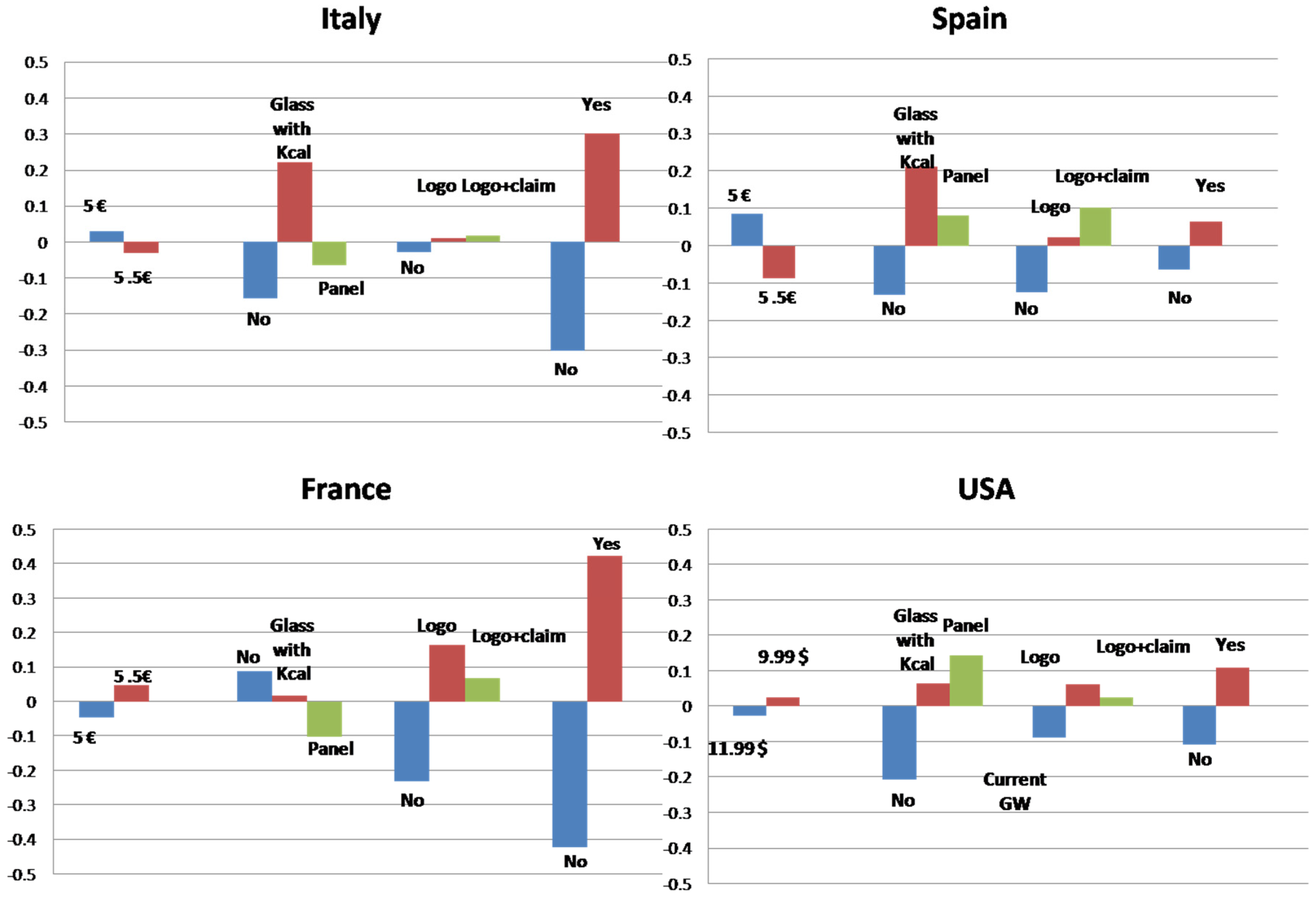 Figure 5, revealing some indications as to how consumers preferred to receive this information on the label. With reference to nutritional information, Italian and Spanish consumers preferred the simplified version of a glass with only kcal. As regards health warnings, greater utility was assigned to the full version with a logo and claim. French consumers instead attached more utility to the version without nutritional information, expressing a preference for the health warning with only a logo. US consumers preferred the detailed version of nutritional information (with a nutritional panel). While with reference to the health warning, they tended to attach more utility to the version with only the logo instead of the current one (with only the government warning).