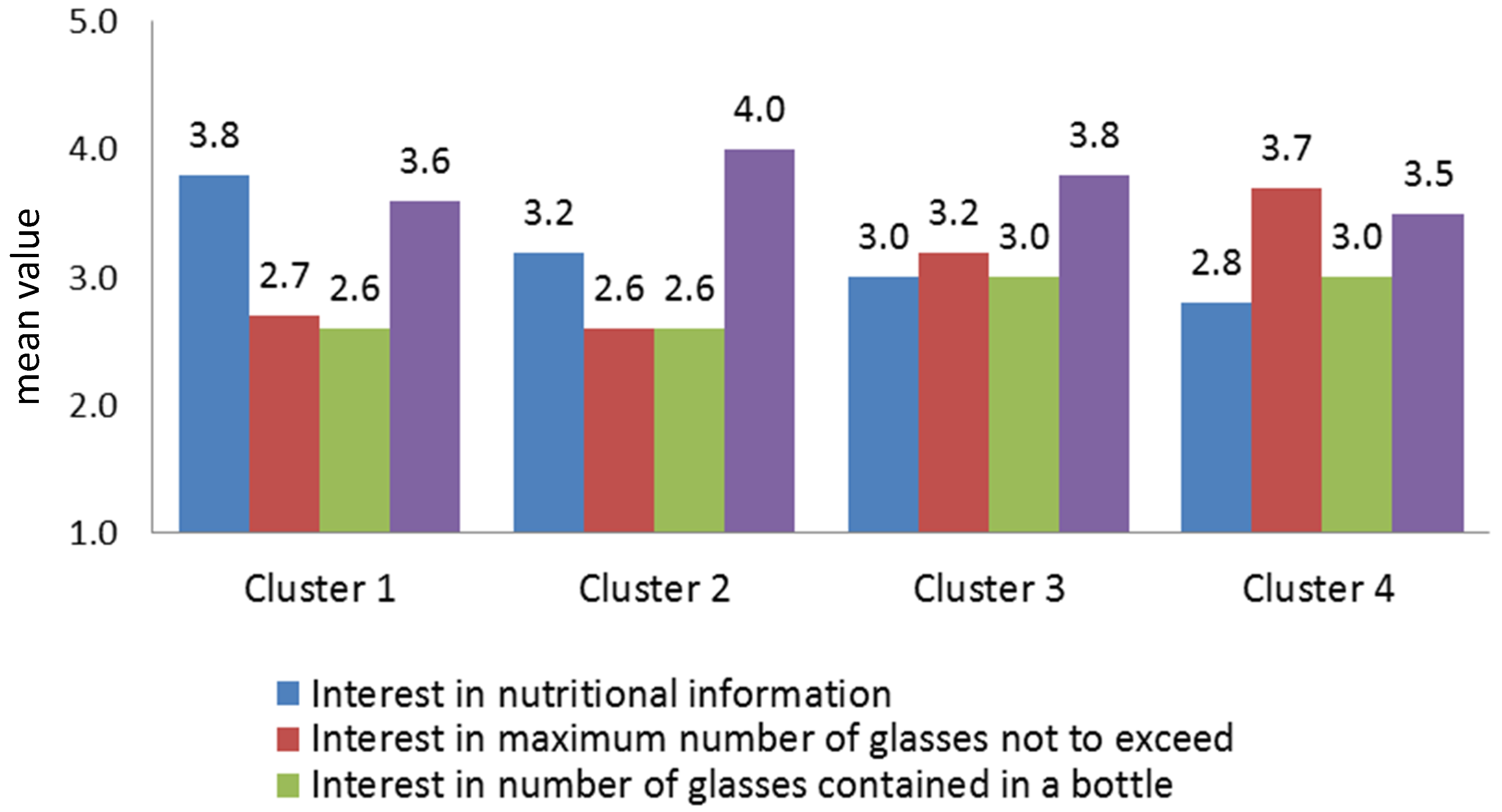 Figure 6, the identified clusters differ significantly in relation to the degrees of usefulness attached to the proposed additional information on wine labels (nutritional value, health warning and indication of number of glasses not to exceed, and number of glasses contained in a bottle). Furthermore, the univariate ANOVA showed the existence of significant differences between the groups in relation to variables linked to the use and familiarity of information provided on wine labels.