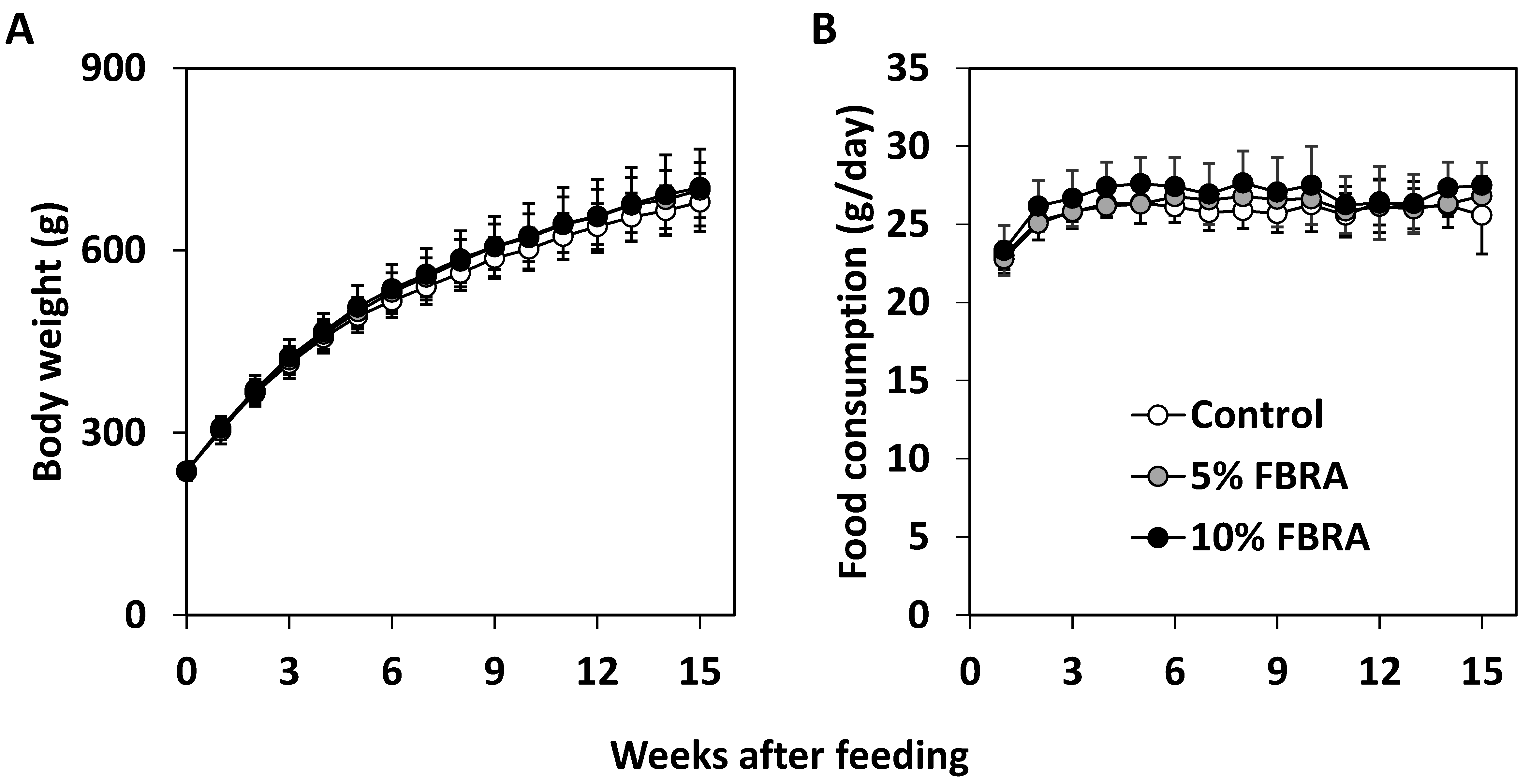 (A) Effect of exposure to fermented rice and rice bran with Aspergillus oryzae (FBRA) on the body weight of transgenic rat for adenocarcinoma of prostate (TRAP) rats. Body weights of rats are represented as the average of each group and plotted as a function of time (weeks) for each group; (B) Effect of FBRA on daily food consumption by TRAP rats. Food consumption by each rat (grams per day) was recorded weekly throughout the experimental period in each group.