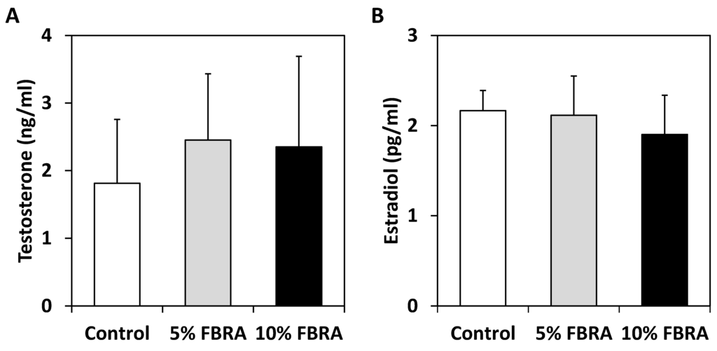 Six-week-old TRAP male rats (n = 36) were divided into 3 groups of 12 rats each. FBRA was obtained from Genmai Koso Co. Ltd., (Sapporo, Japan) and freshly prepared for administration to the treatment groups. The animals were fed a diet containing 0%, 5%, or 10% FBRA for 15 weeks, and body weight and food consumption were estimated weekly. At experimental week 15, under deep isoflurane anesthesia, blood was collected from 9:00 to 11:00 h to measure testosterone and estradiol levels using chemiluminescence immunoassays obtained from a commercial laboratory (The Tohkai Cytopathology Institute, Gifu, Japan). The urogenital complex of each rat was removed as a whole together with the seminal vesicles, then the ventral prostate (VP) was weighed. A part of the prostate glands was immediately frozen in liquid nitrogen and stored at −80 °C until processed, and the remaining tissue was fixed in formalin. The liver and kidneys were also removed, weighed, and fixed. The tissues were routinely processed into paraffin-embedded sections and stained with hematoxylin and eosin.