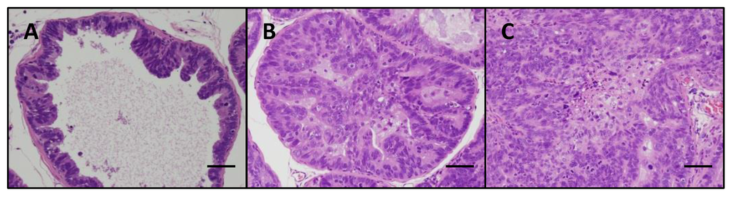 Representative histological findings for (A) low-grade prostatic intraepithelial neoplasia; (B) high-grade prostatic intraepithelial neoplasia; and (C) adenocarcinoma. Scale bars, 50 μm.