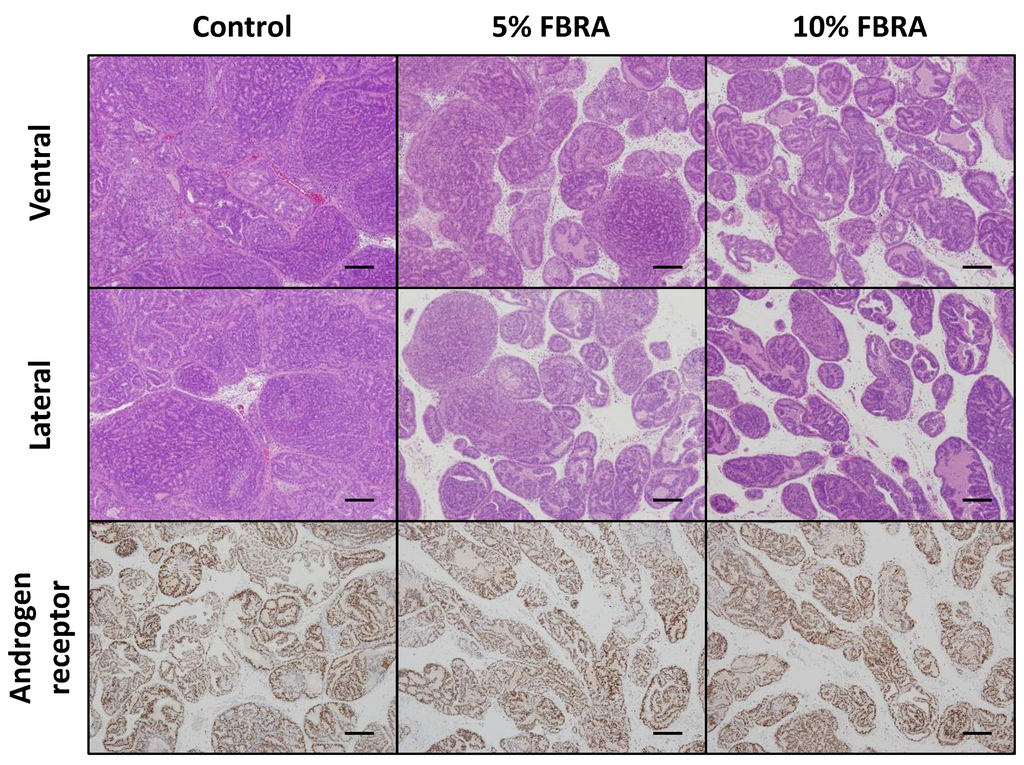Effects of FBRA on prostatic lesions. Representative histopathological findings for lesions in the ventral prostate (VP) and lateral prostate (LP) of the control group and the 5% and 10% FBRA groups. The lower panels show immunohistochemical staining for androgen receptor. Scale bars, 200 μm.