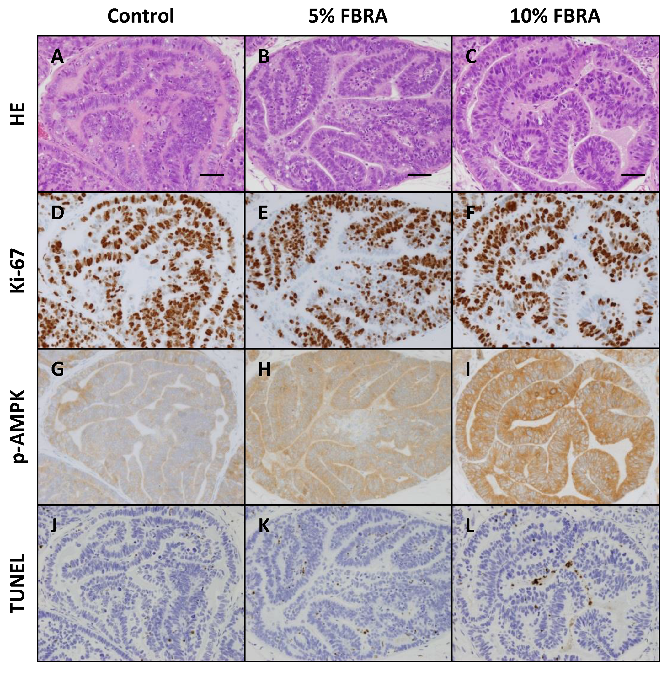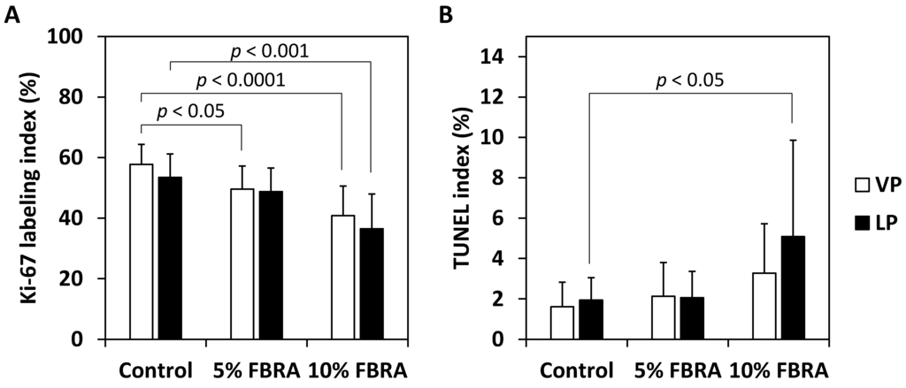 The Ki-67 index, which indicates cell proliferation, of HG-PIN in the VP and LP of the group fed 10% FBRA was significantly lower than that of the control group (Figure 5A) (p < 0.0001 and 0.001, respectively). The apoptotic index of HG-PIN as determined by TUNEL assay in the LP of the group fed 10% FBRA was significantly higher than that of the control group (Figure 5B) (p < 0.05).
