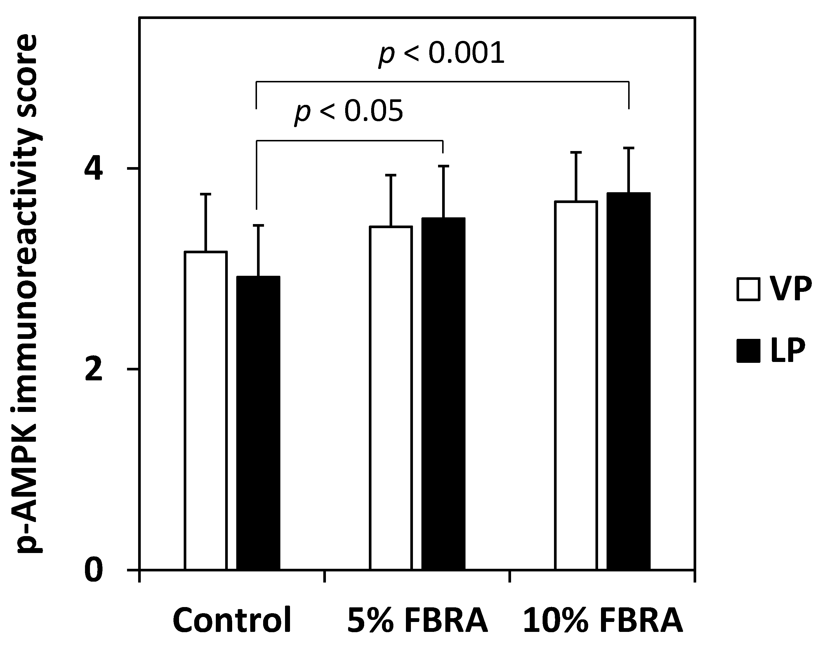 To further understand the mechanistic effect of FBRA on prostate carcinogenesis in TRAP rats, the hypothesis that FBRA activates AMPK was examined. The immunoreactivity scores for phospho-AMPK in HG-PIN in the lateral prostate of rats fed 5% and 10% FBRA were significantly increased compared with those of controls (p < 0.05 and 0.001, respectively) (Figure 6 and Figure 7).