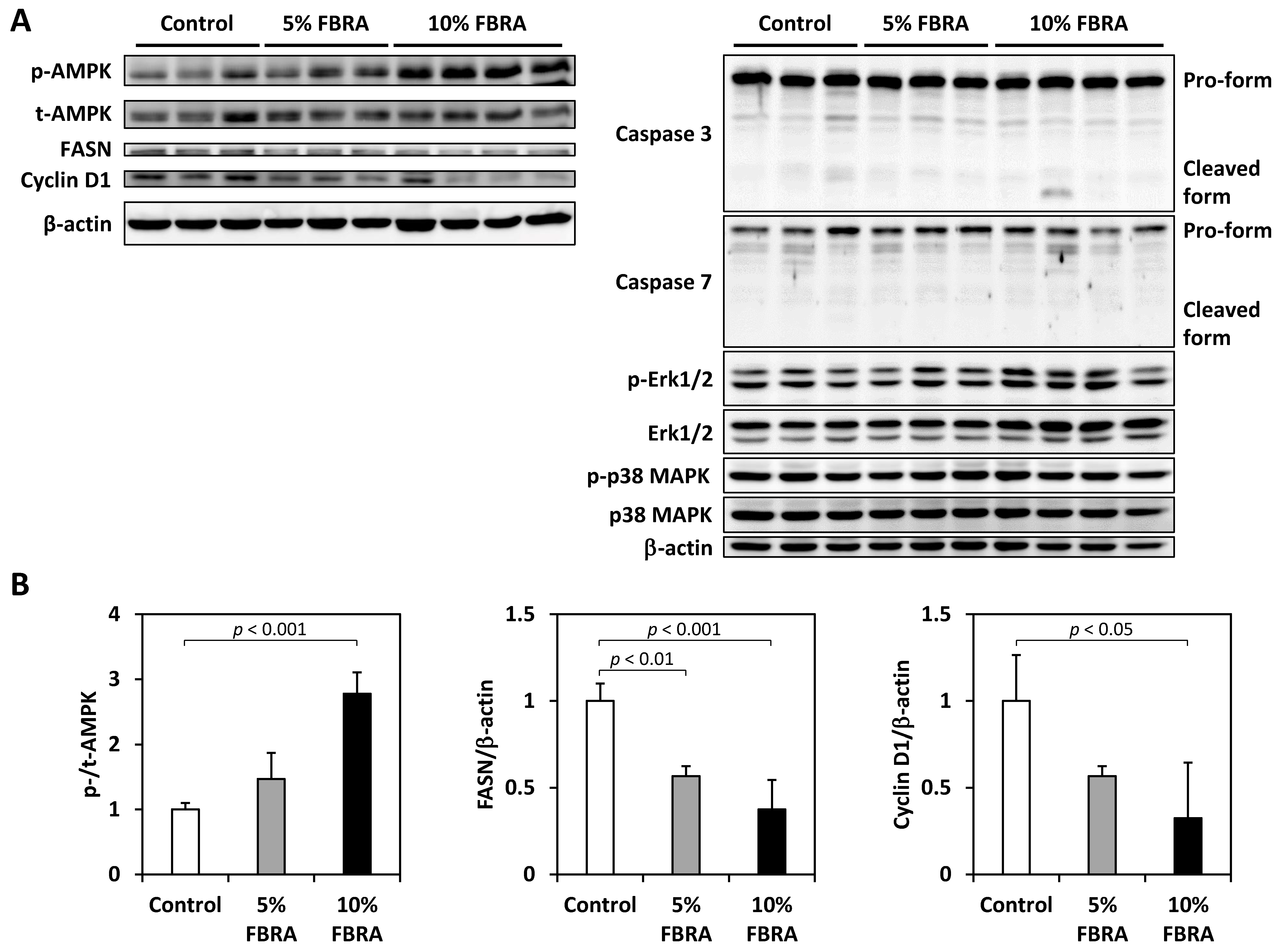 Immunoblot analyses also demonstrated that p-AMPK expression was upregulated, while fatty acid synthase (FASN) and cyclin D1 expression were downregulated in the LP of rats treated with FBRA. Meanwhile, no changes in the expression of caspase 3 and 7, Erk1/2, or p38 MAPK were evident (Figure 8).