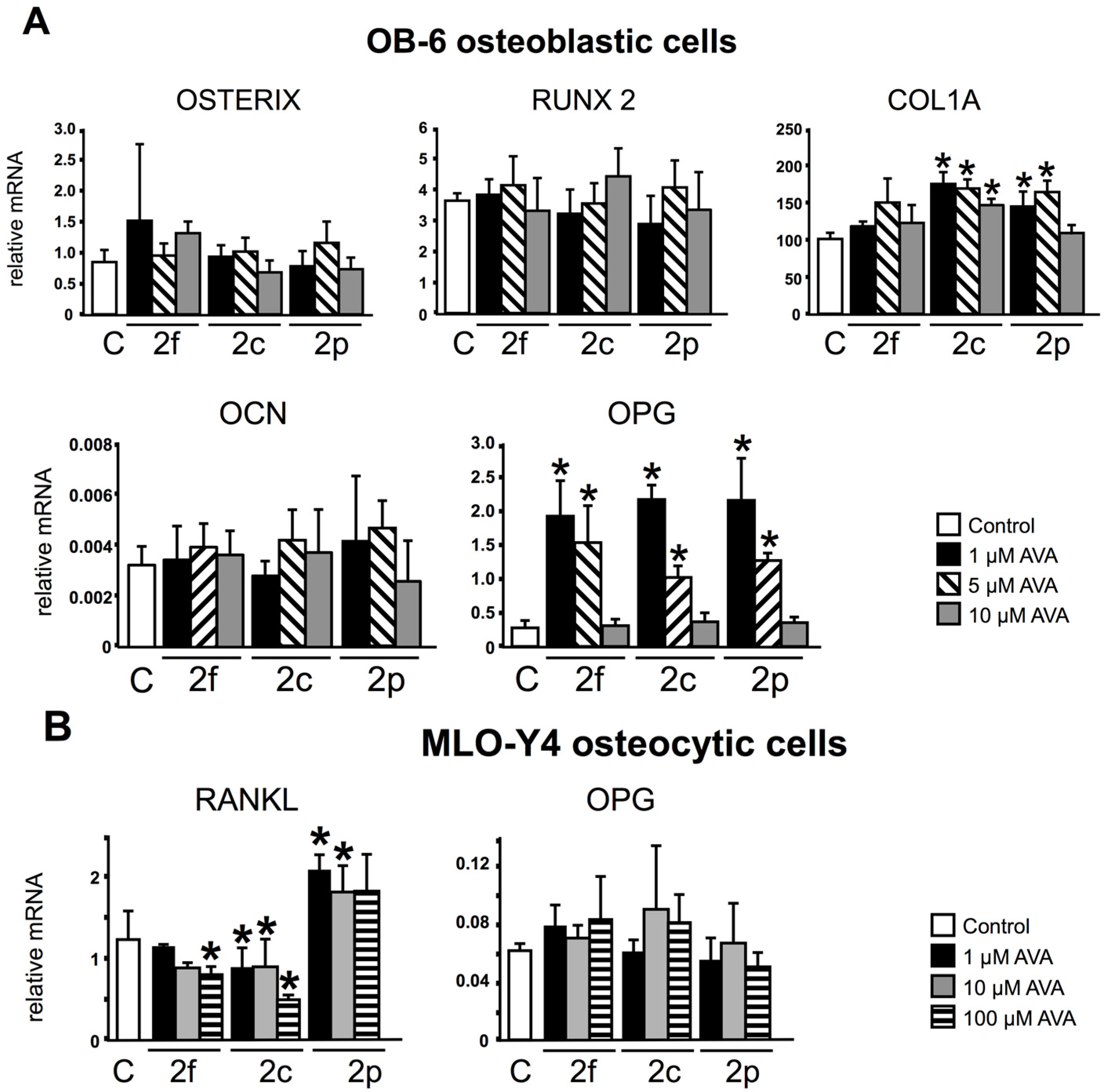 Osteoblasts express extracellular matrix proteins such as alkaline phosphatase, OCN and COL1A during the cell proliferation, matrix maturation, and mineralization phases [52]. The levels of mRNA expression of these osteoblast markers allows distinguishing the stages of differentiation and maturation of osteoblasts. COL1A among others, is secreted during the early stage of osteogenic differentiation, whereas OCN is a marker of a mature osteoblasts [53,54,55]. Our results revealed that AVA 2c and 2p potentially enhanced osteogenic differentiation by increasing the expression levels of COL1A. Cells of the osteoblastic lineage, osteoblasts, osteocytes and stromal/osteoblastic cells, play an important role in bone remodeling by expressing pro- and anti-osteoclastogenic cytokines [56,57,58,59]. These cells express the master osteoclast differentiation factor RANKL in response to osteoclast-stimulating hormones and cytokines, including PTH, tumor necrosis factor and interleukin-1; and they also express the RANKL decoy receptor OPG that inhibits osteoclastogenesis [45,58,60,61,62]. OPG protects bone from excessive resorption by preventing RANKL from binding to its receptor (RANK) [63]. In our study, the lowest doses of all three AVAs increased OPG in OB-6 cells, suggesting a beneficial effect of AVAs by inhibiting osteoclast differentiation. Furthermore, we found that AVAs 2f and 2c decrease RANKL expression in MLO-Y4 osteocytic cells. Taken together these findings suggest that AVAs could modulate osteoclastogenesis by altering the expression of RANKL and OPG. Future studies are required to examine the relevance of our in vitro findings for the potential beneficial effects of AVAs on the skeleton in vivo; and the mechanistic basis of the differential effects of individual AVAs on bone cell gene expression.